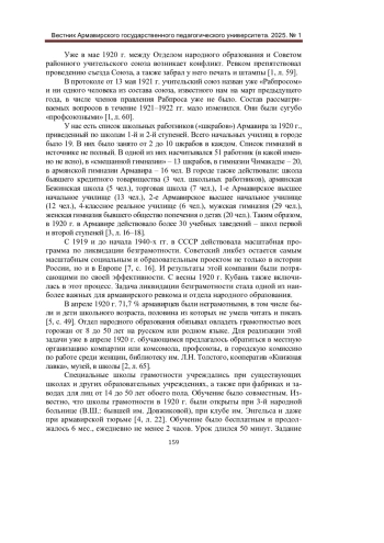 Статья посвящена истории деятельности отдела народного образования Армавирского революционного комитета с момента установления в городе советской власти в марте 1920 г. и в течение примерно первого года ее существования. В статье рассмотрены организационные мероприятия ревкома, направленные на создание системы народного образования и просвещения в Армавире, налаживание работы с учительским составом города, меры по ликвидации безграмотности, в том числе организация школ грамотности, пунктов ликбеза, элементы программы обучения безграмотных. Отдельно в статье уделено внимание мероприятиям по организации дошкольного воспитания. Уже в первый же год своего существования в Армавире советская власть в лице своих местных органов занялась и социально проблемными категориями детей и подростков, в том числе детьми с ограниченными возможностями здоровья и несовершеннолетними преступниками. В Армавире были организованы детские приюты, детские трудовые колонии, детские площадки.