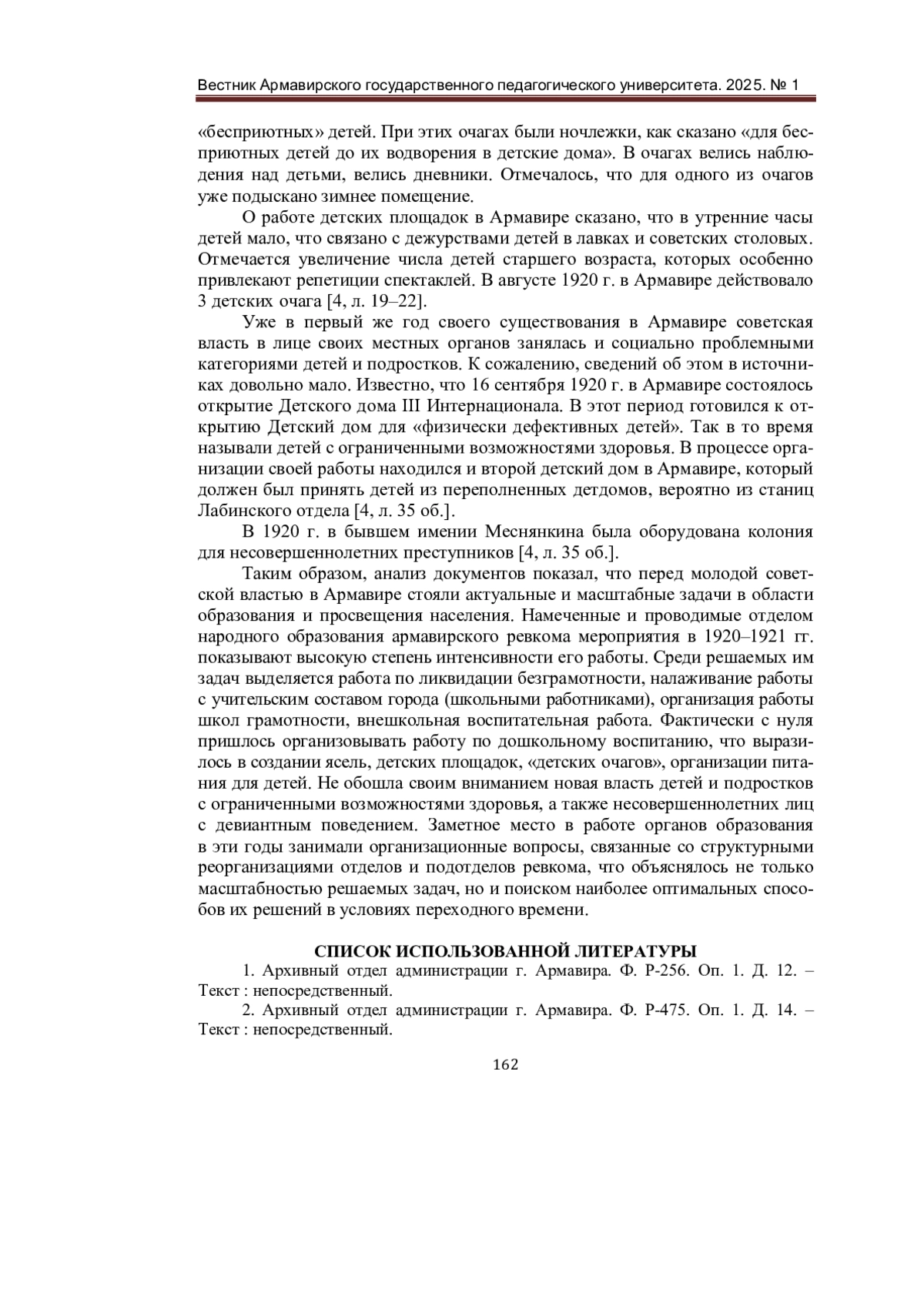 3. Архивный отдел администрации г. Армавира. Ф. Р-475. Оп. 1. Д. 25. - Текст: непосредственный.
