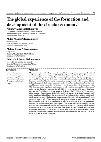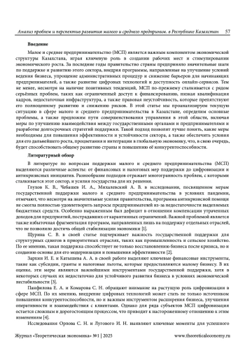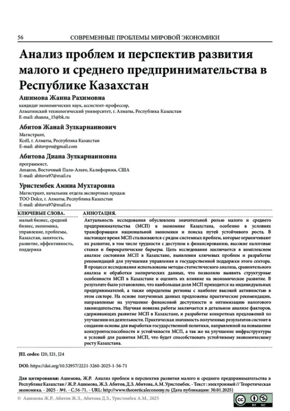 Актуальность исследования обусловлена значительной ролью малого и среднего предпринимательства (МСП) в экономике Казахстана, особенно в условиях трансформации национальной экономики и поиска путей устойчивого роста. В настоящее время МСП сталкиваются с рядом системных проблем, которые ограничивают их развитие, в том числе трудности с доступом к финансированию, высокие налоговые ставки и бюрократические барьеры. Цель исследования заключается в комплексном анализе состояния МСП в Казахстане, выявлении ключевых проблем и разработке рекомендаций для улучшения управления и государственной поддержки этого сектора. В процессе исследования использованы методы статистического анализа, сравнительного анализа и обработки эмпирических данных, что позволило выявить структурные особенности МСП в Казахстане и оценить их влияние на экономическое развитие. В результате было установлено, что наибольшая доля МСП приходится на индивидуальных предпринимателей, а также определены регионы с наиболее высокой активностью в этом секторе. На основе полученных данных предложены практические рекомендации, направленные на улучшение финансовой доступности и оптимизацию налогового законодательства. Научная новизна работы заключается в детальном анализе факторов, сдерживающих развитие МСП в Казахстане, и разработке конкретных предложений по улучшению их деятельности. Практическая значимость полученных результатов состоит в создании основы для выработки государственной политики, направленной на повышение конкурентоспособности и устойчивости МСП, а так же на улучшение инфраструктуры и условий для развития МСП, что будет способствовать устойчивому экономическому росту Казахстана.