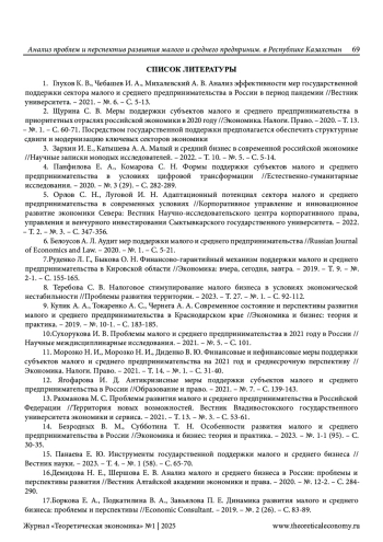 1. Глухов К. В., Чебашев И. А., Михалевский А. В. Анализ эффективности мер государственной поддержки сектора малого и среднего предпринимательства в России в период пандемии //Вестник университета. - 2021. - №. 6. - С. 5-13. ;. DOI: 10.26425/1816-4277-2021-6-5-13 EDN: VNJSBX
