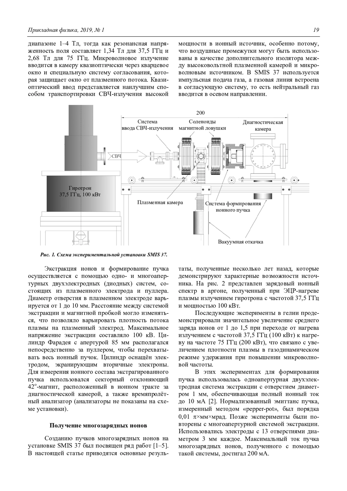 В настоящее время в ряде ионных электронно-циклотронных резонансных (ЭЦР) источников для создания и нагрева плазмы используется мощное микроволновое излучение современных гиротронов. Вследствие большой мощности излучения такие системы работают в основном в импульсном режиме. Этот тип ионных ЭЦР-источников был разработан в Институте прикладной физики Российской академии наук, и большая часть экспериментальных исследований была выполнена на установке SMIS 37. Для создания плазмы на SMIS 37 использовались гиротроны с частотами 37,5 и 75 ГГц и максимальными мощностями 100 и 200 кВт, соответственно. Такое микроволновое излучение позволяло создавать плазму с уникальными параметрами: электронной плотностью более 1013 см–3, электронной температурой 50–300 эВ, ионной температурой около 1 эВ. Принципиальное отличие этих систем от традиционных ЭЦР-источников состоит в реализации так называемого квазигазодинамического режима удержания плазмы в ловушке. В соответствии с режимом удержания такие источники были названы «газодинамическими ЭЦР-источниками». В этих системах время жизни плазмы обычно составляет несколько десятков микросекунд, что в сочетании с высокой электронной концентрацией приводит к формированию плазменных потоков из ловушки с плотностями до 1–10 А/см2. Была продемонстрирована возможность создания пучков МЗИ (азот, аргон) и протонных (дейтронных) пучков с токами на уровне сотен мА при среднеквадратичном нормализованном эмиттансе порядка 0,1 ×мм×мрад. Следующим шагом в исследованиях является переход к непрерывному режиму работы газодинамического ионного ЭЦР-источника (ЭЦР ИИ). С этой целью в ИПФ РАН создаётся новая экспериментальная установка. Для получения плазмы в будущем источнике будет использоваться излучение гиротронов на частотах 28 и 37,5 ГГц. В настоящей работе дан обзор полученных результатов и состояния дел по монтажу нового источника.