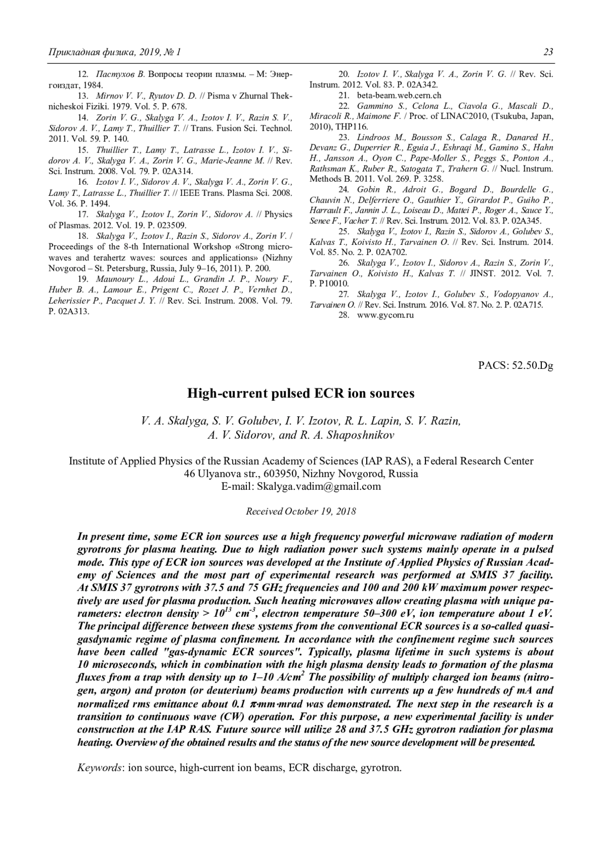 17. Skalyga V., Izotov I., Zorin V., Sidorov A. // Physics of Plasmas. 2012. Vol. 19. P. 023509.