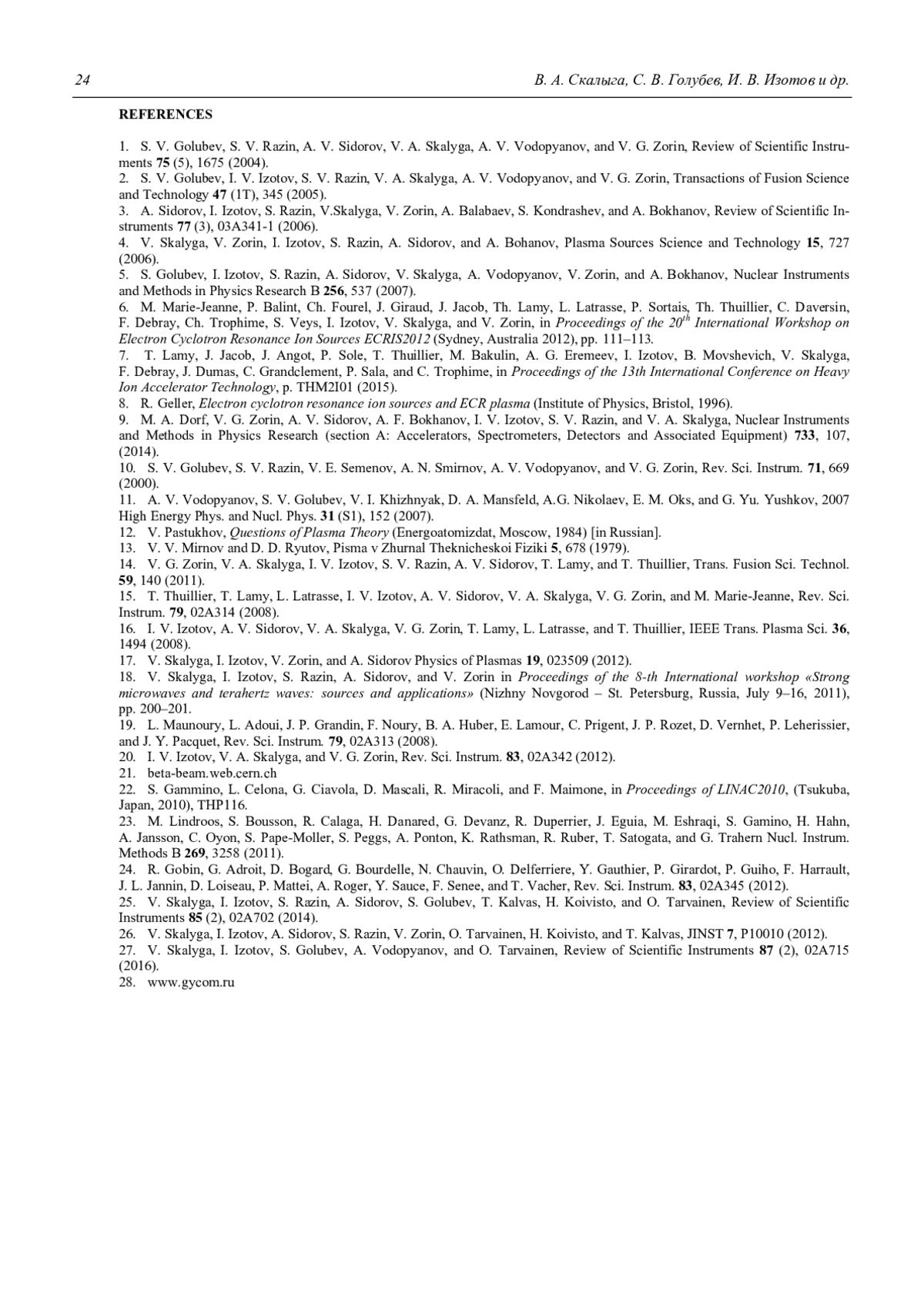 25. Skalyga V., Izotov I., Razin S., Sidorov A., Golubev S., Kalvas T., Koivisto H., Tarvainen O. // Rev. Sci. Instrum. 2014. Vol. 85. No. 2. Р. 02A702.