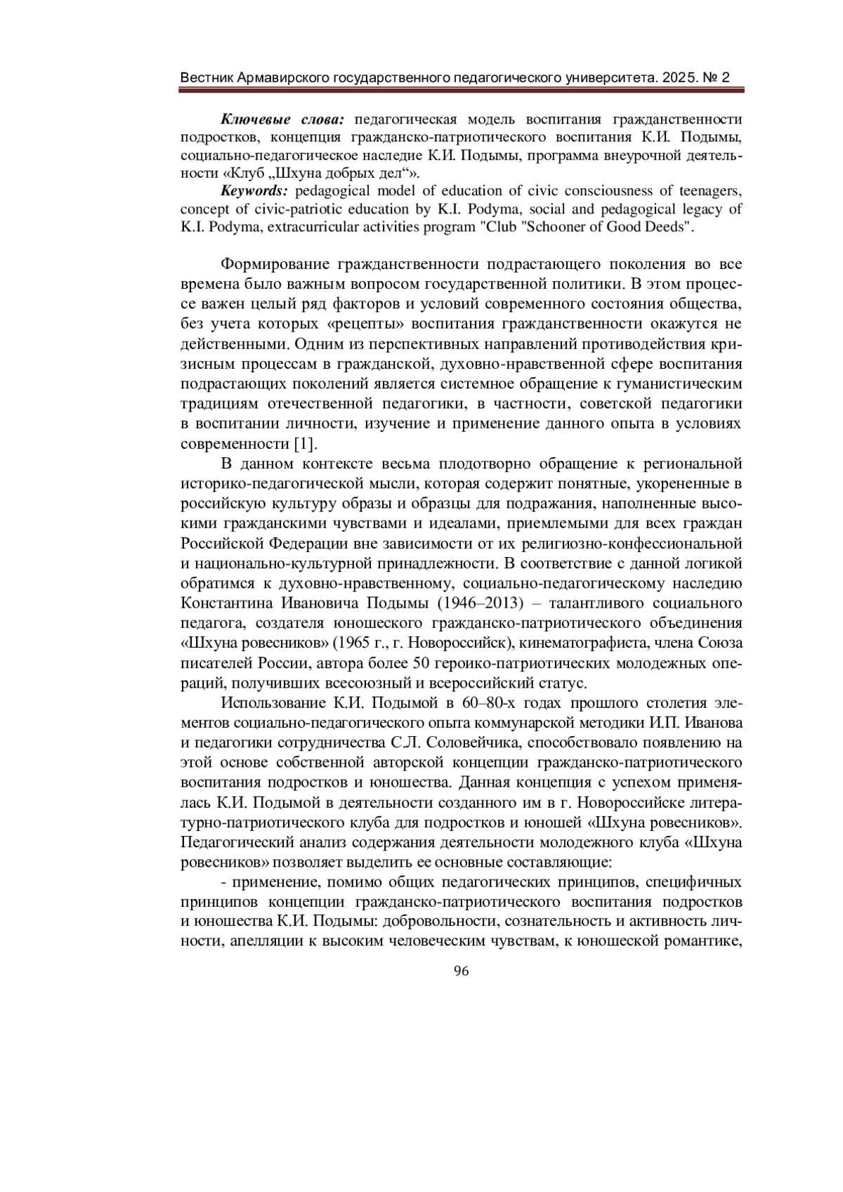 Статья посвящена анализу состояния гражданско-патриотического воспитания молодежи в контексте современных социально-педагогических вызовов. Актуальность статьи определяется наличием серьезных противоречий в гражданско-патриотическом воспитании молодежи, обусловленных доминированием в настоящее время инструментально-технологической основы российского образования над его идеальной, духовно-нравственной сферой. В качестве предмета исследования анализируется продолжение идей педагогики общей заботы И. П. Иванова, педагогики сотрудничества С. Л. Соловейчика в социально-педагогическом наследии К. И. Подымы и разработка на этой основе собственной авторской (К. И. Подымы) концепции гражданско-патриотического воспитания подростков и юношества. Данная концепция с успехом применялась К. И. Подымой в 60-90-е годы прошлого столетия в деятельности созданного им в Новороссийске литературно-патриотического клуба для подростков и юношей «Шхуна ровесников». Авторы рассматривают педагогическое наследие К. И. Подымы в аспекте преемственности для современной социально-педагогической практики воспитания гражданственности и патриотизма у подрастающих поколений, актуальное в контексте идей суверенизации страны и опоры на ценностные основания российской культуры.