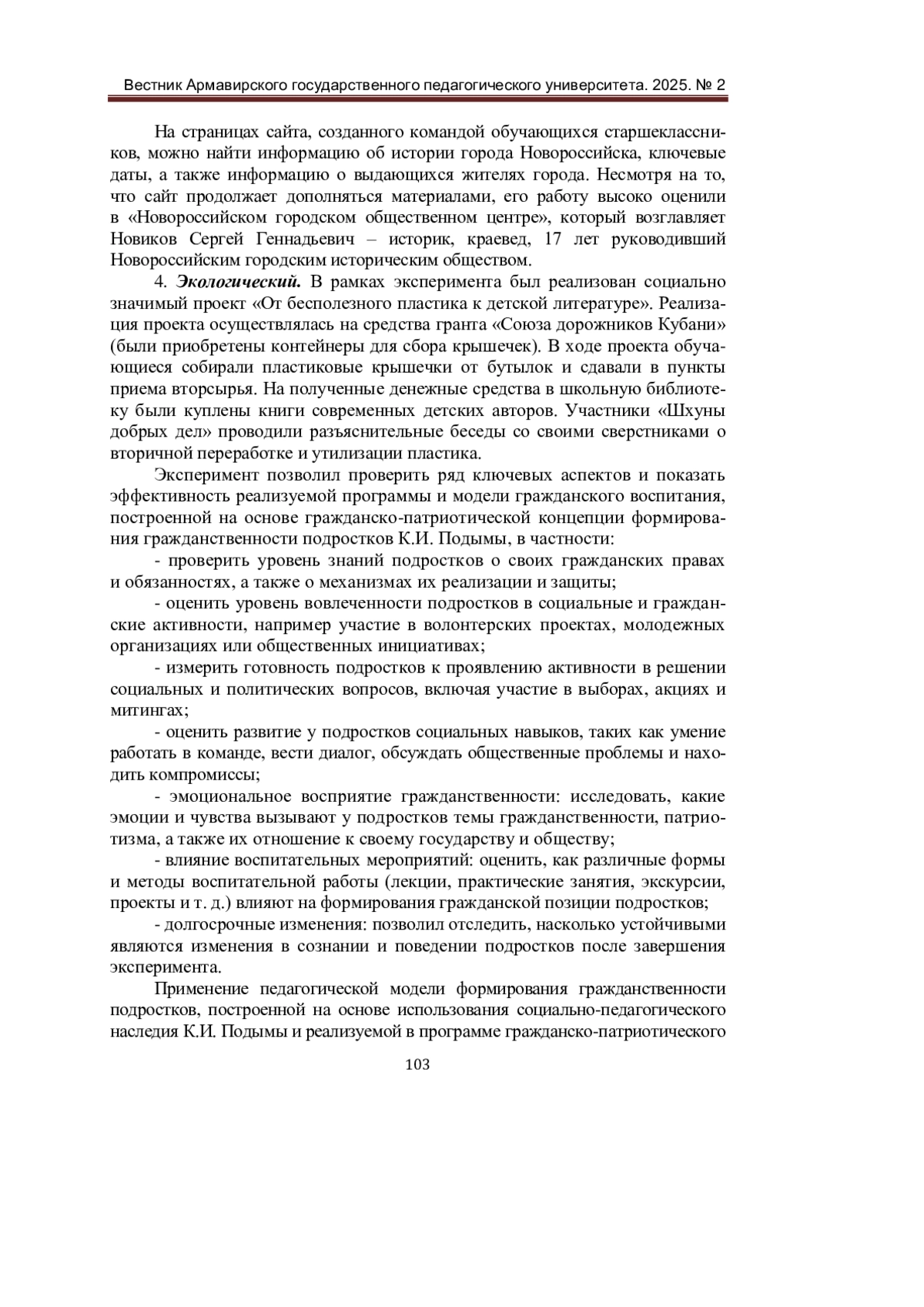 Целью статьи является экспериментальная апробация модели воспитания гражданственности подростков в общеобразовательных учреждениях на основе социально-педагогического наследия К. И. Подымы (1946-2013), чья активная гражданская, социально-педагогическая деятельность пришлась на вторую половину 60-х годов прошлого столетия - нулевые годы нашего века. Педагогическая апробация данной модели осуществлялась с помощью программы внеурочной деятельности «Клуб «Шхуна добрых дел» в МБОУ гимназии № 4 г. Новороссийска. Базовой основой программы явилась концепция гражданско-патриотического воспитания подростков и юношества К. И. Подымы, включающая в себя элементы коммунарской методики И. П. Иванова и педагогики сотрудничества С. Л. Соловейчика. Экспериментальная проверка модели гражданско-патриотического воспитания подростков на основе социально-педагогического наследия К. И. Подымы подтвердила ее эффективность. Полученные данные позволяют прогнозировать возможность внедрения педагогической модели воспитания гражданственности подростков на основе духовно-нравственного, социально-педагогического наследия К. И. Подымы в систему школьного образования с целью эффективного формирования и укрепления духовно-нравственных, гражданско-патриотических ориентиров подрастающего поколения.
