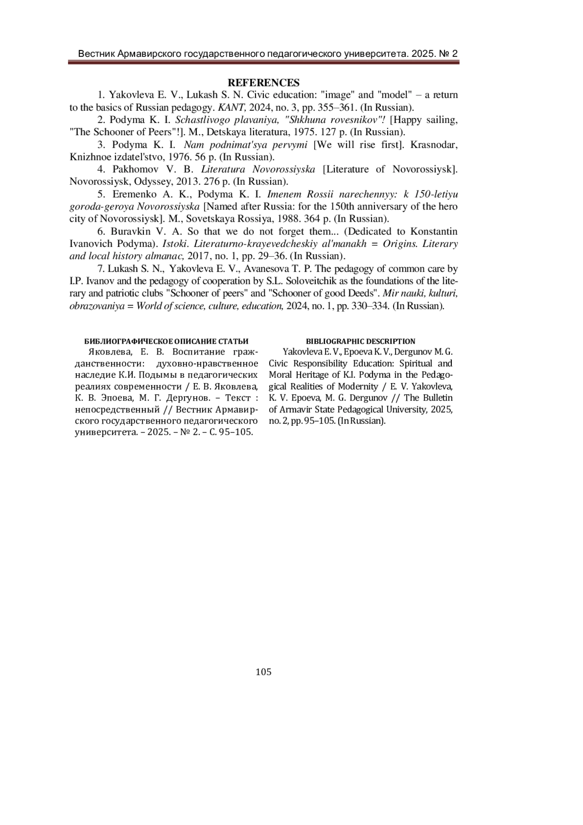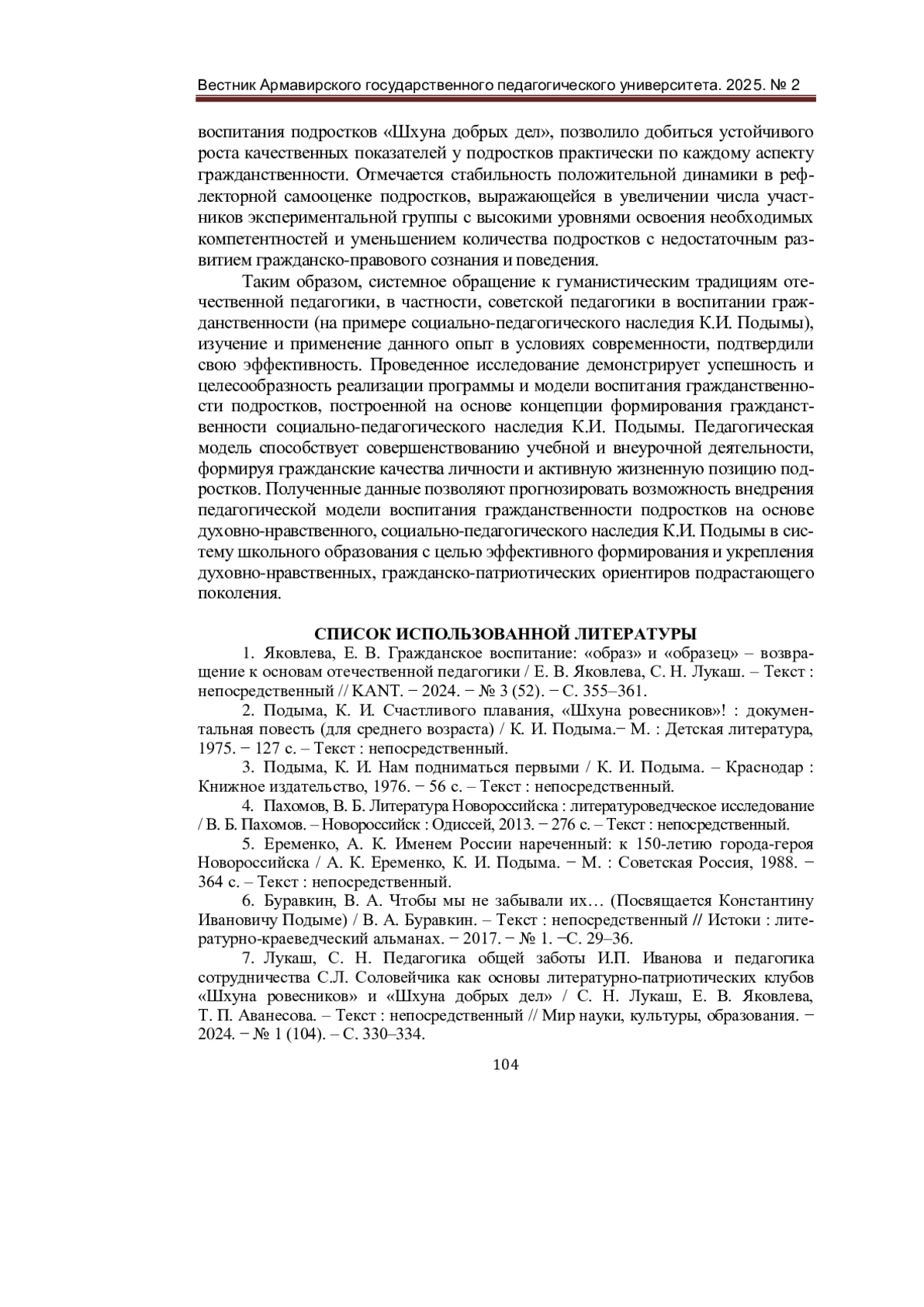1. Яковлева, Е. В. Гражданское воспитание: “образ” и “образец” - возвращение к основам отечественной педагогики / Е. В. Яковлева, С. Н. Лукаш. - Текст: непосредственный // KANT. - 2024. - № 3 (52). - С. 355-361. EDN: ZZQVKI