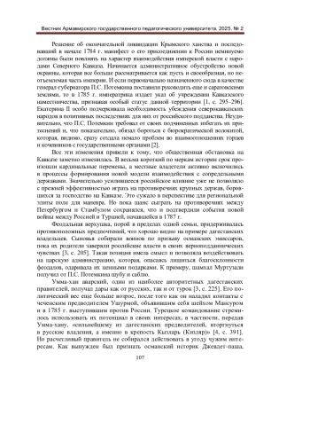 Решение об окончательной ликвидации Крымского ханства и последовавший в начале 1784 г. манифест о его присоединении к России неминуемо должны были повлиять на характер взаимодействия имперской власти с народами Северного Кавказа. Начинается административное обустройство новой окраины, которая все больше рассматривается как пусть и своеобразная, но неотъемлемая часть империи. И если первоначально назначенного сюда в качестве генерал-губернатора П. С. Потемкина поставили руководить еще и саратовскими землями, то в 1785 г. императрица издает указ об учреждении Кавказского наместничества, признавая особый статус данной территории [1, с. 295–296]. Екатерина II особо подчеркивала необходимость убеждения северокавказских народов в позитивных последствиях для них от российского подданства. Неудивительно, что П. С. Потемкин требовал от своих подчиненных избегать их притеснений и, что показательно, обязал бороться с бюрократической волокитой, которая, видимо, сразу создала немало проблем во взаимоотношениях горцев и кочевников с государственными органами [2].