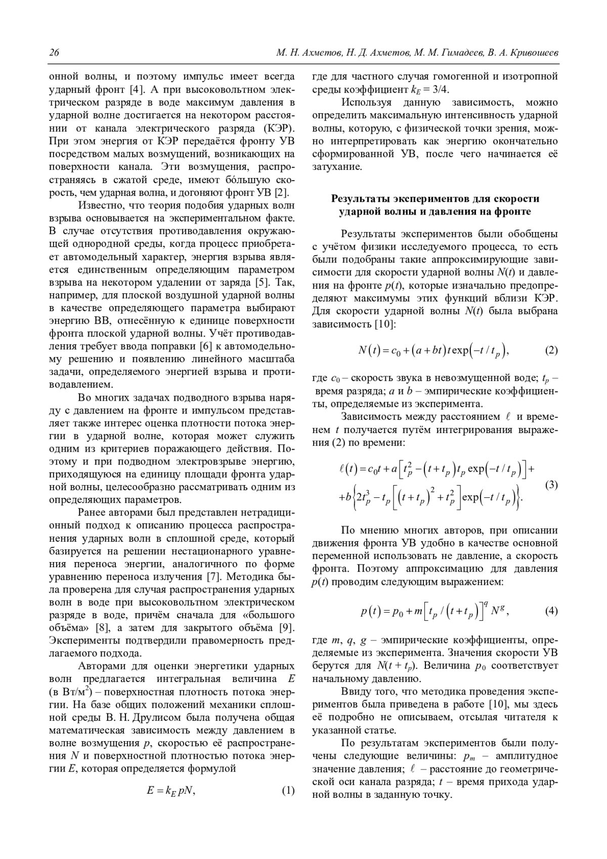 M. N. Akhmetov, N. D. Akhmetov, M. M. Gimadeev, and V. A. Krivosheev Method of calculating shock wave front generation and motion on a high voltage electric discharge in water 25