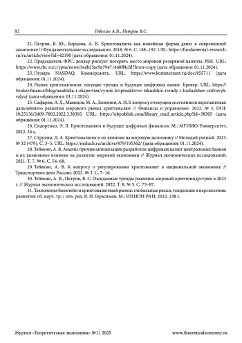 30. Тебекин, А. В., Петров, В. С. Ожидаемые тренды развития мировой криптоиндустрии в 2023 г. // Журнал экономических исследований. 2022. Т. 8. № 5. С. 75-87.