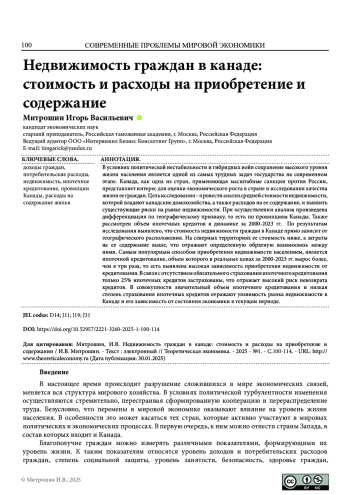 В условиях политической нестабильности и гибридных войн сохранение высокого уровня жизни населения является одной из самых трудных задач государства на современном этапе. Канада, как одна из стран, применяющая масштабные санкции против России, представляет интерес для оценки экономического роста в стране и исследования качества жизни ее граждан. Цель исследования - провести анализ средней стоимости недвижимости, которой владеют канадские домохозяйства, а также расходов на ее содержание, и выявить существующие риски на рынке недвижимости. При осуществлении анализа произведена дифференциация по географическому признаку, то есть по провинциям Канады. Также рассмотрен объем ипотечных кредитов в динамике за 2000-2023 гг. По результатам исследования выявлено, что стоимость недвижимости граждан в Канаде прямо зависит от географического расположения. На северных территориях ее стоимость ниже, а затраты на ее содержание выше, что отражают определенную обратную взаимосвязь между ними. Самым популярным способом приобретения недвижимости населением, является ипотечной кредитование, объем которого в реальных ценах за 2000-2023 гг. вырос более, чем в три раза, то есть выявлена высокая зависимость приобретения недвижимости от кредитования. В связи с отсутствием обязательного страхования ипотечного кредитования только 25% ипотечных кредитов застрахованы, что отражает высокий риск невозврата кредитов. В совокупности значительный объем ипотечного кредитования и низкая степень страхования ипотечных кредитов отражают уязвимость рынка недвижимости в Канаде и его зависимость от состояния экономики в текущем периоде.