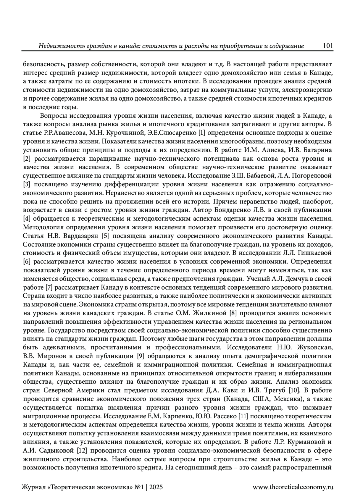 Вопросы исследования уровня жизни населения, включая качество жизни людей в Канаде, а также вопросы анализа рынка жилья и ипотечного кредитования затрагивают и другие авторы. В статье Р. Р. Аванесова, М. Н. Курочкиной, Э. Е. Слюсаренко [1] определены основные подходы к оценке уровня и качества жизни. Показатели качества жизни населения многообразны, поэтому необходимы установить общие принципы и подходы к их определению. В работе И. М. Алиева, И. В. Батарина [2] рассматривается наращивание научно-технического потенциала как основа роста уровня и качества жизни населения. В современном обществе научно-техническое развитие оказывает существенное влияние на стандарты жизни человека. Исследование З. Ш. Бабаевой, Л. А. Погореловой [3] посвящено изучению дифференциации уровня жизни населения как отражению социально-экономического развития. Неравенство является одной из серьезных проблем, которые человечество пока не способно решить на протяжении всей его истории.