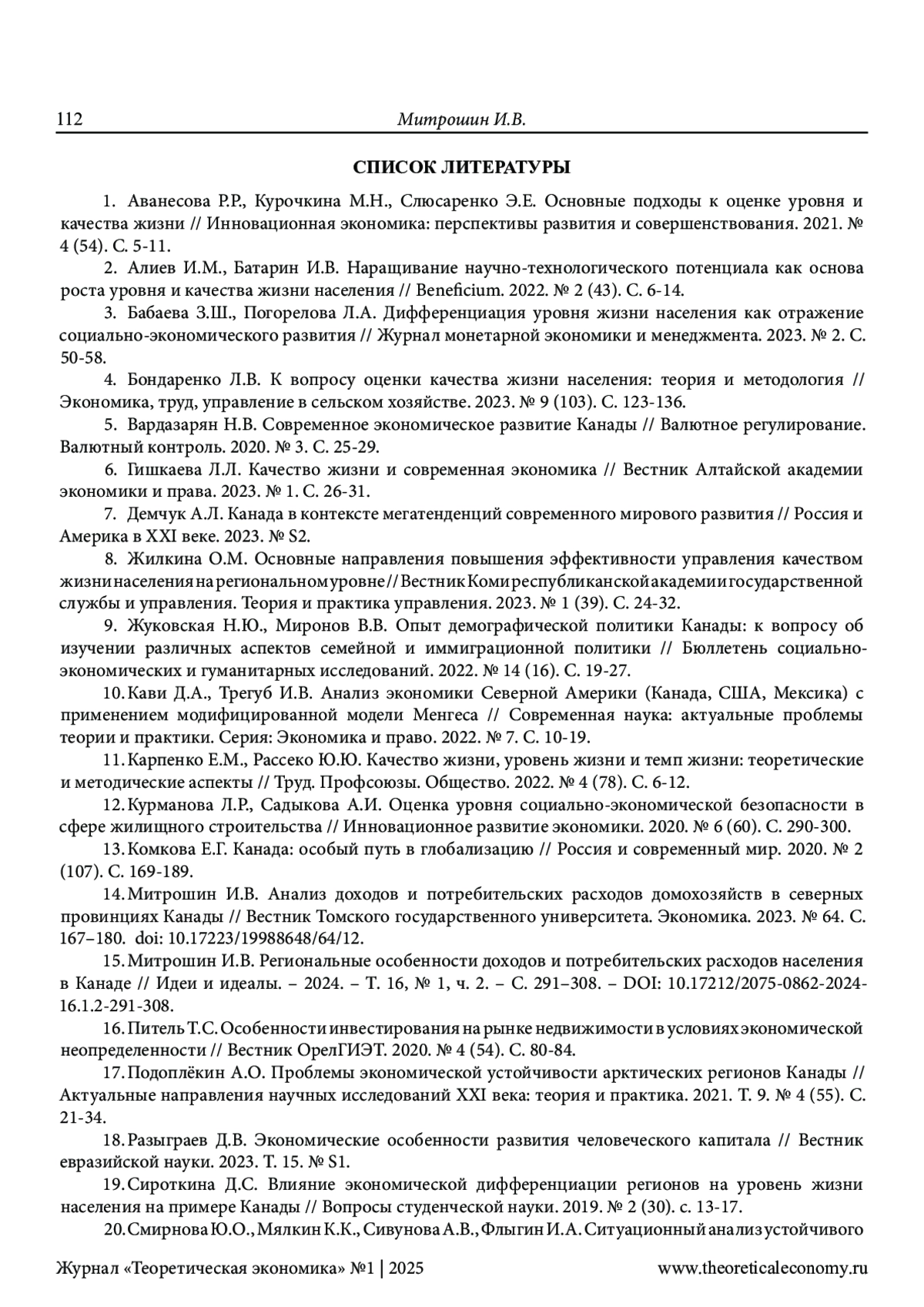14. Митрошин И.В. Анализ доходов и потребительских расходов домохозяйств в северных провинциях Канады // Вестник Томского государственного университета. Экономика. 2023. № 64. С. 167-180. DOI: 10.17223/19988648/64/12 EDN: OETNNP