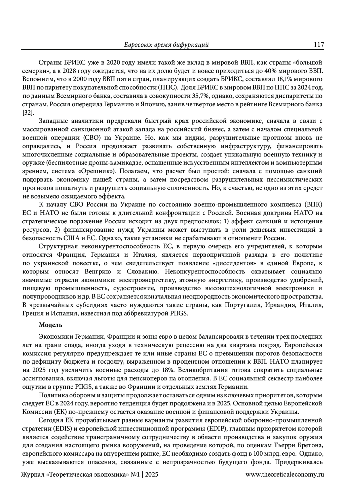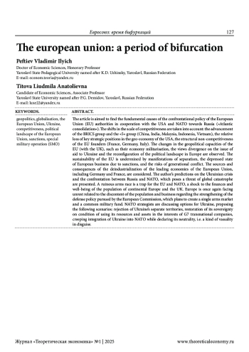 Статья нацелена на поиск глубинных причин конфронтационной политики властей Евросоюза (ЕС) вместе с США и НАТО к России («атлантическая солидарность»). Учтены сдвиги в масштабах конкурентоспособности: выдвижение группы БРИКС и группы «5» (Китай, Индия, Малайзия, Индонезия, Вьетнам), относительная потеря США ключевых позиций в геоэкономике, структурная неконкурентоспособность учредителей ЕС (Франции, Германии, Италии). Отражены такие изменения в геополитическом потенциале Евросоюза (+ Великобритания), как милитаризация экономики, расхождение взглядов в вопросе оказания помощи Украине, реконфигурация политического ландшафта в Европе. Устойчивость ЕС расшатывается проявлениями сепаратизма, подавленным из-за санкций состоянием европейского бизнеса, рисками конфликта поколений. Рассмотрены истоки и последствия деиндустриализации ведущих экономик Европейского Союза, среди которых оказались Германия и Франция. Высказаны авторские прогнозы по украинскому кризису и конфронтации между Россией и НАТО, которая создает угрозу глобальной катастрофы. Разорительная гонка вооружений является ловушкой для ЕС и НАТО, шок для финансов и благосостояния населения континентальной Европы и Великобритании. Европу вновь ожидают волнения, связанные с недовольством населения и бизнеса в отношении усиления оборонной политики, проводимой Европейской Комиссией, в планах которой создание единого рынка вооружений и общего военного фонда. Стратеги НАТО обсуждают варианты развития событий на Украине, предлагая следующие сценарии: отторжение отдельный территорий Украины, восстановление суверенитета при условии использования ее ресурсов и активов в интересах ТНК G7, ползучая интеграция Украины в НАТО при декларациях о ее нейтралитете, то есть своего рода вассалитет под прикрытием.