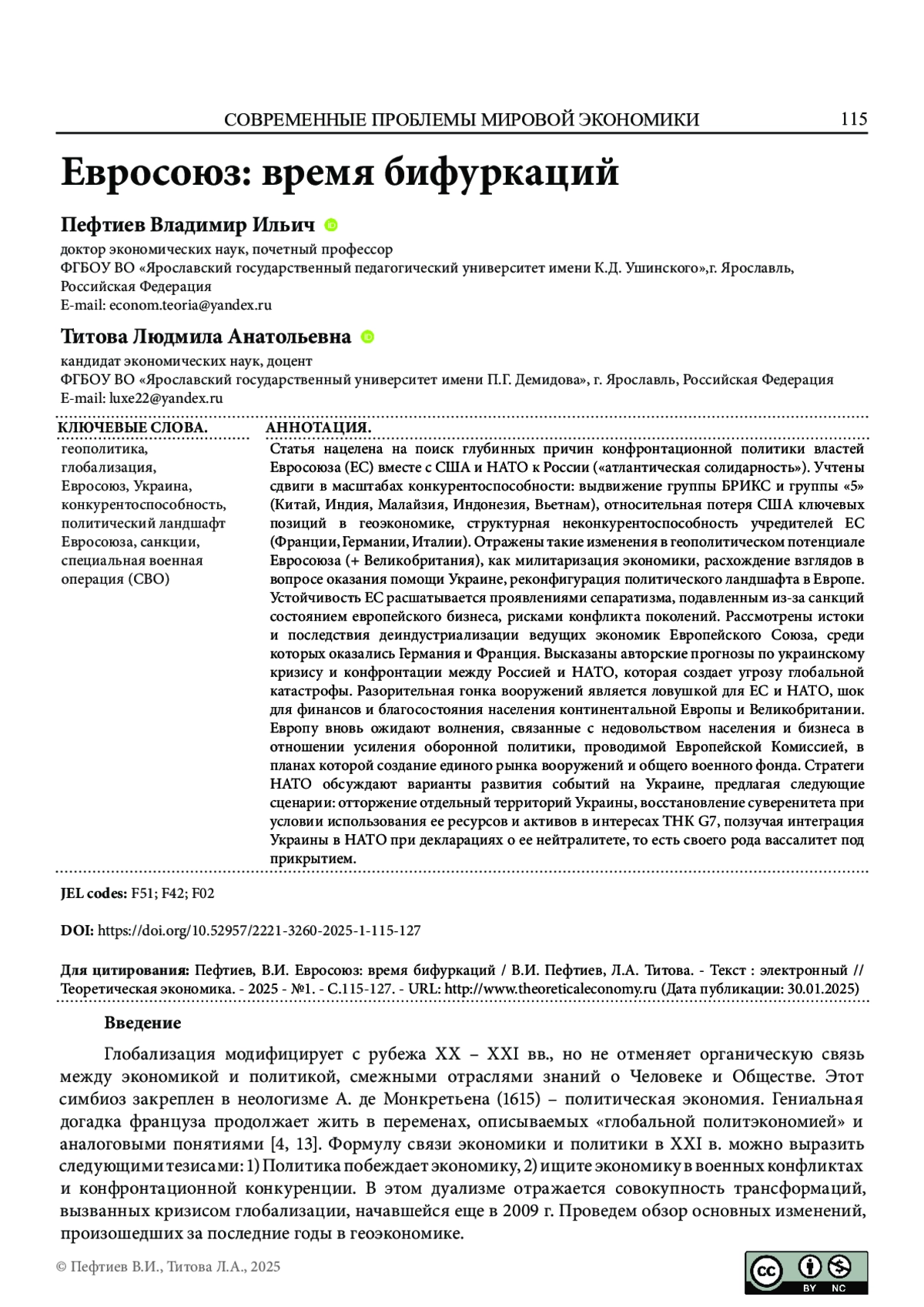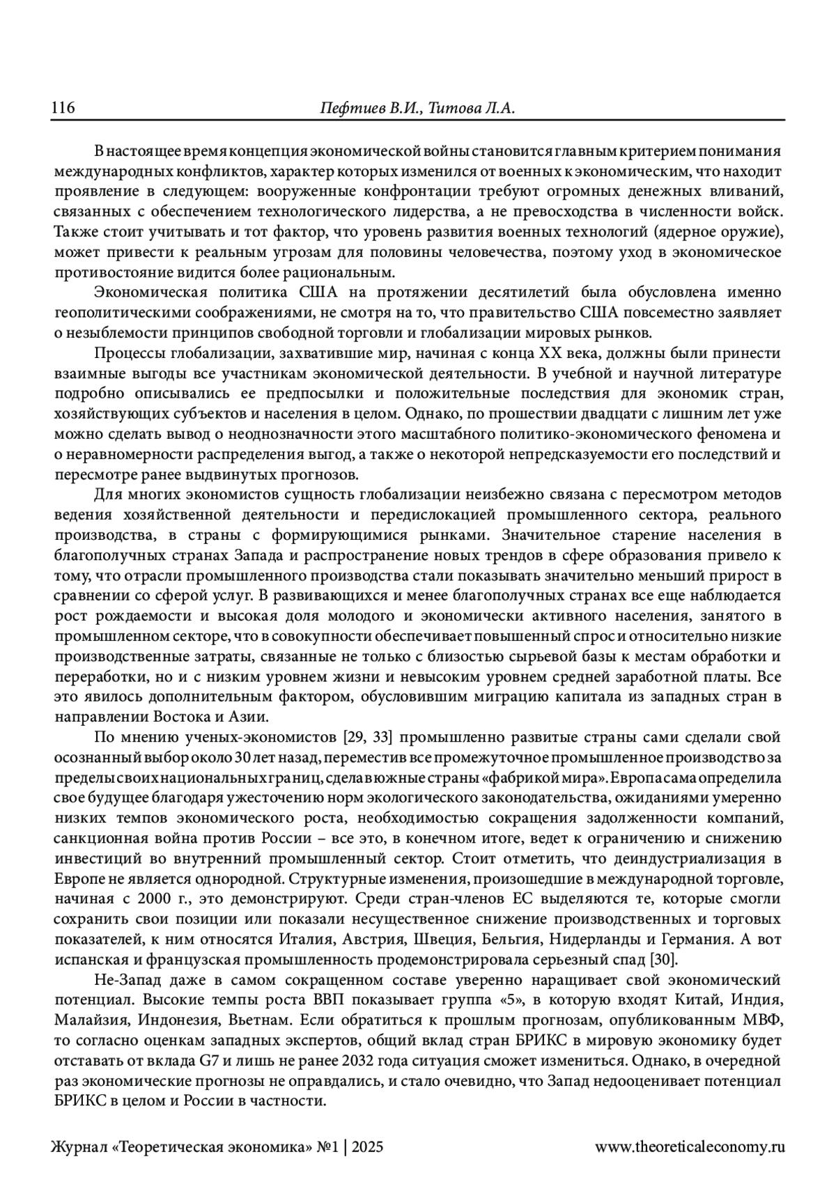 15. Пефтиев В.И., Титова Л.А. рецессия и геополитика: проблемное поле политэкономии. Ярославль: РИО ЯГПУ, 2022. 167 с. EDN: CMTHAA