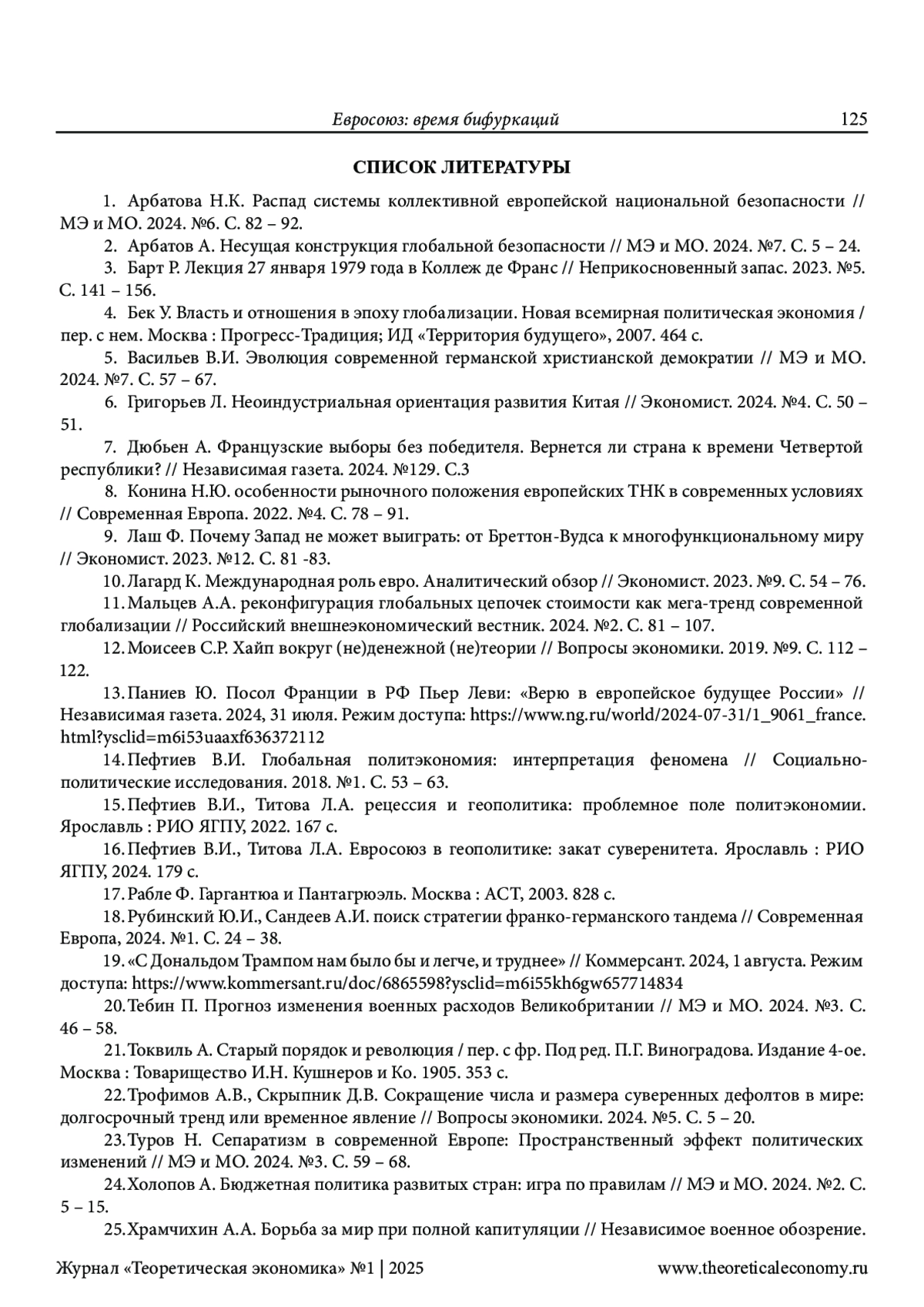 1. Арбатова Н.К. Распад системы коллективной европейской национальной безопасности // МЭ и МО. 2024. №6. С. 82 - 92. ;. DOI: 10.20542/0131-2227-2024-68-6-82-92 EDN: GGTZRE