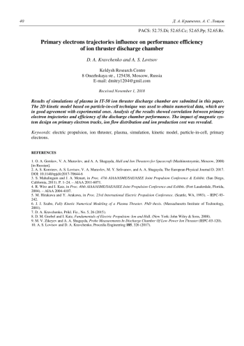 D. A. Kravchenko and A. S. Lovtsov Primary electrons trajectories influence on performance efficiency of ion thruster discharge cham-ber 35