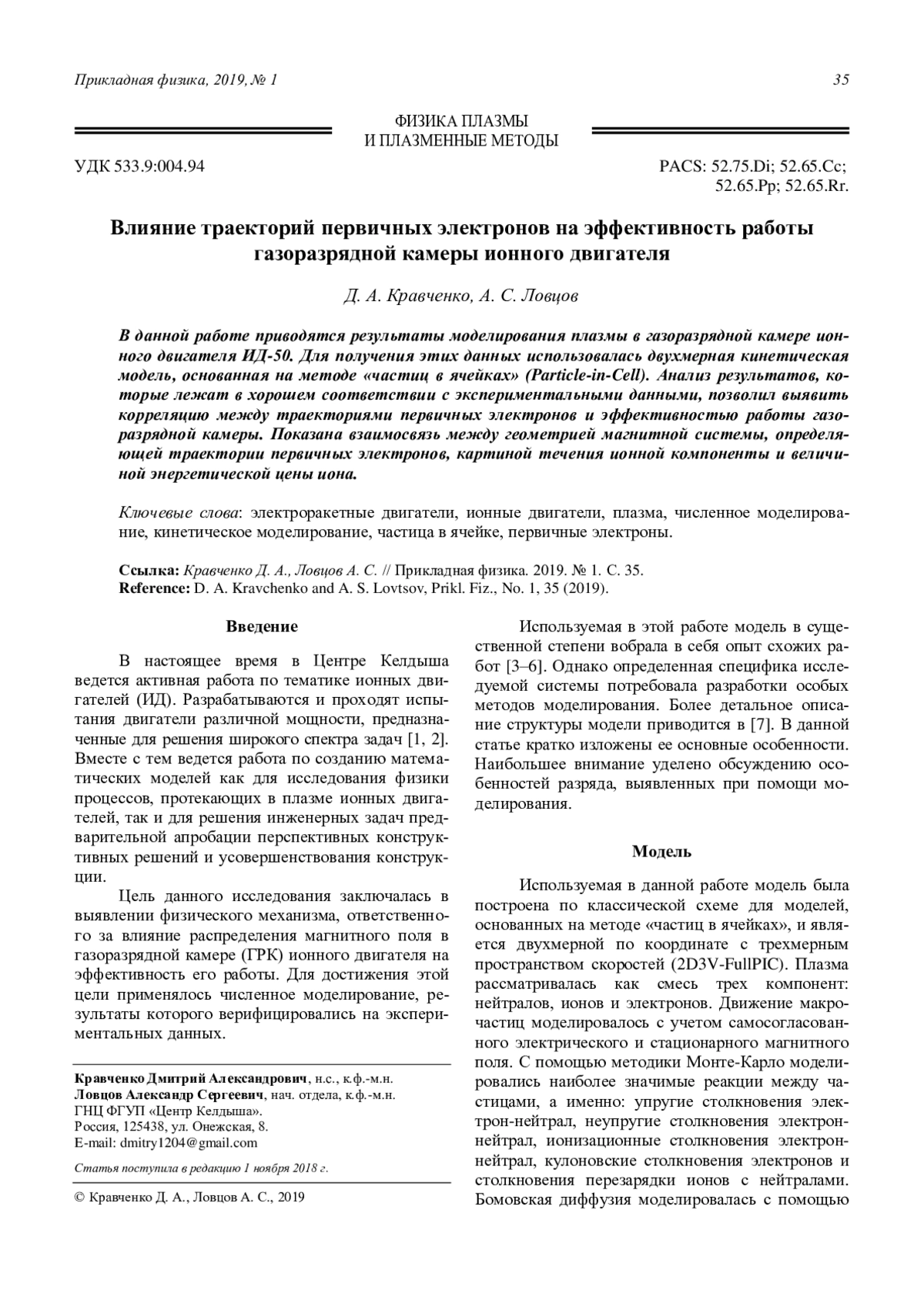 Кравченко Д. А., Ловцов А. С. Влияние траекторий первичных электронов на эффективность работы газоразрядной камеры ионного двигателя 35 Балданов Б. Б., Ранжуров Ц. В., Сордонова М. Н., Будажапов Л. В. Влияние плазменной модификации поверхности семян зерновых культур на их посевные свойства 41