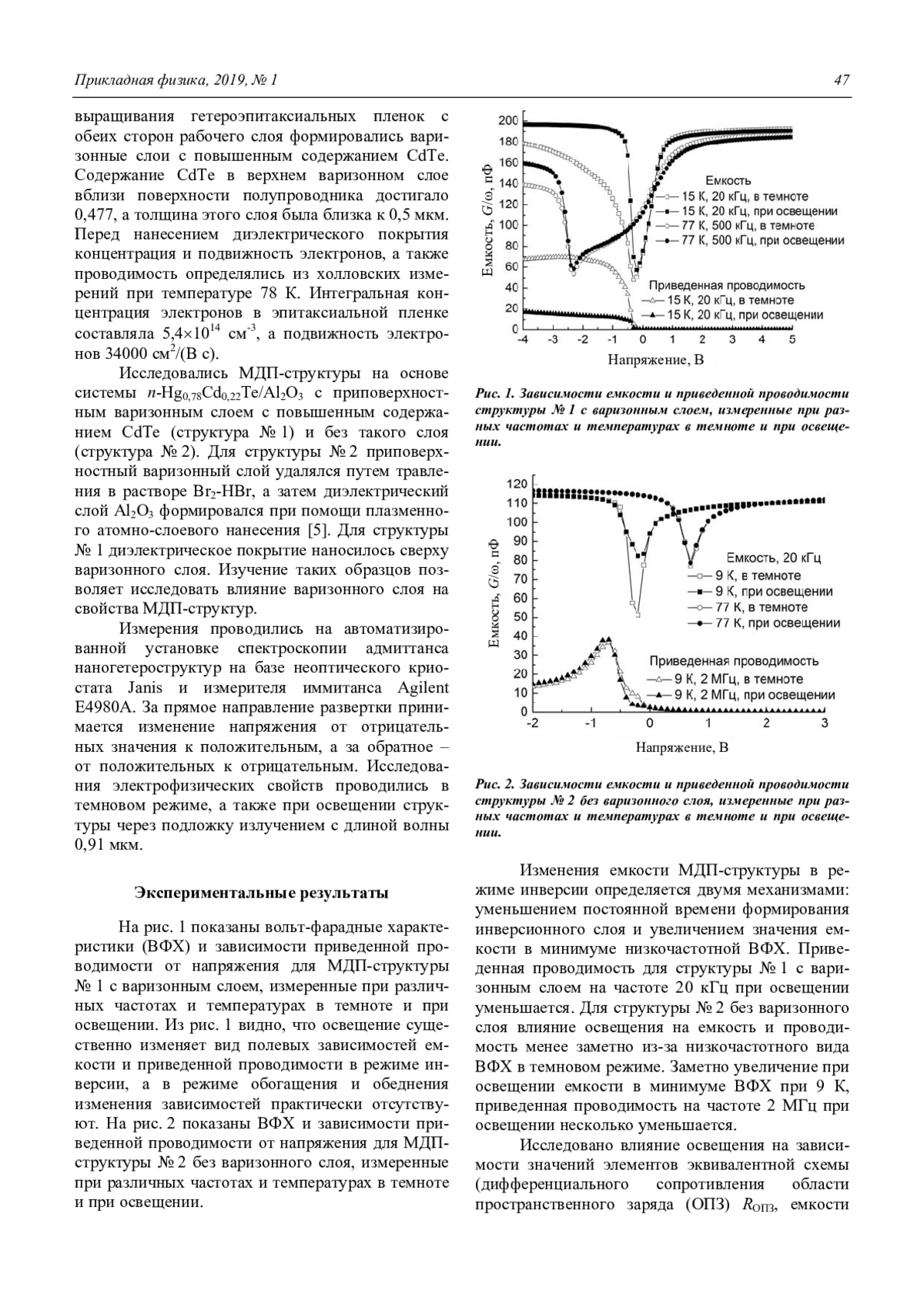 Таким образом, установлено, что освещение существенно изменяет вид полевых зависимостей емкости и приведенной проводимости в режиме инверсии для структуры с варизонным слоем. Изменение емкости МДП-структуры в режиме инверсии происходит по двум механизмам: уменьшение времени формирования инверсионного слоя, увеличение значения емкости в минимуме низкочастотной ВФХ. Приведенная проводимость МДП-структуры при освещении уменьшается на низких частотах, но возрастает на высоких частотах. Влияние освещения на адмиттанс МДПструктур на основе n-Hg0,78Cd0,22Te не проявляется в обеднении и обогащении. Под действием освещения дифференциальное сопротивление ОПЗ уменьшается при температуре 15 К почти в 4,5 раза, а инверсионная емкость возрастает менее чем в 2 раза, что приводит к уменьшению времени формирования инверсионного слоя в широком диапазоне условий. Увеличение емкости ОПЗ при освещении связано с уменьшением максимальной ширины ОПЗ из-за увеличения концентрации носителей в инверсионном слое. Для структур с варизонным слоем и без варизонного слоя при освещении с малой интенсивностью излучения происходит уменьшение поверхностного потенциала, но для структур с варизонным слоем отсутствуют изменения в емкостных характеристиках.