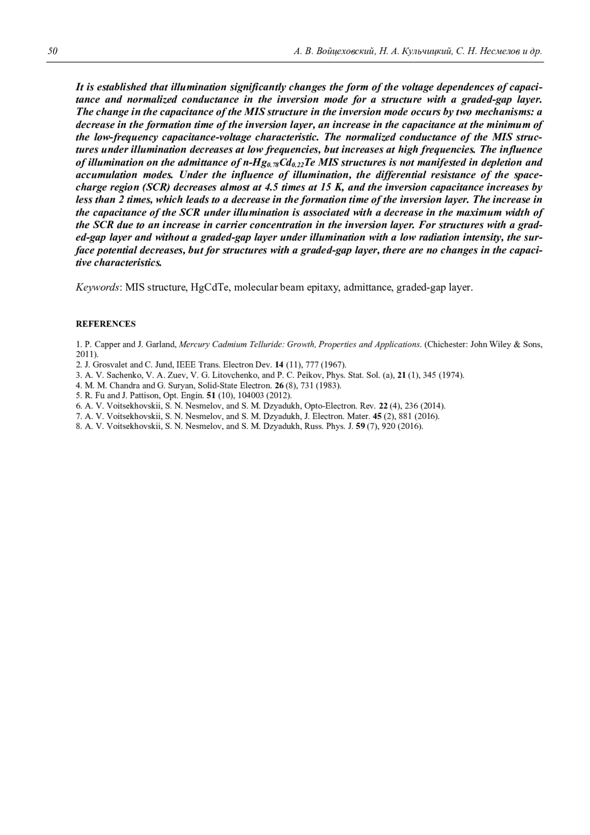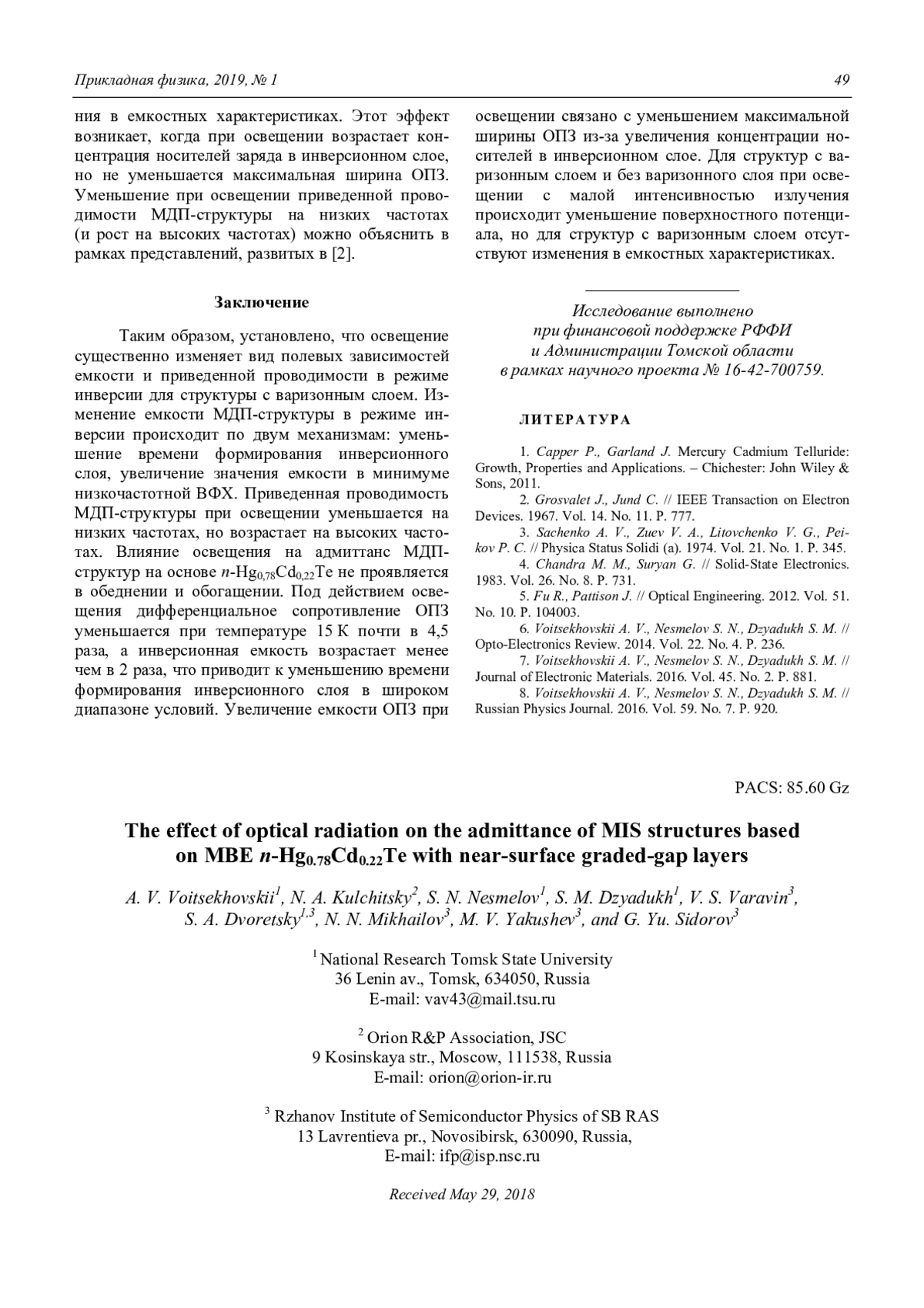 8. Voitsekhovskii A. V., Nesmelov S. N., Dzyadukh S. M. // Russian Physics Journal. 2016. Vol. 59. No. 7. P. 920.