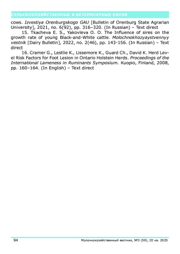 15. Ткачева, Е.С., Влияние быков-производителей на скорость роста молодняка крупного рогатого скота черно-пестрой породы / Е.С. Ткачева, О.О. Яковлева // Молочнохозяйственный вестник. - 2022. - № 2 (46). - С. 143-156.
