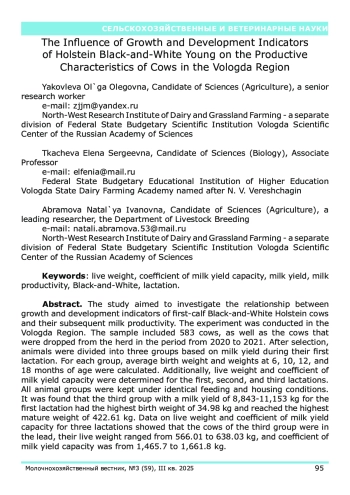 Целью исследования стало изучение взаимосвязи между параметрами роста и развития первотелок чернопестрой голштинизированной породы и их дальнейшей молочной продуктивностью. Эксперимент был реализован на территории Вологодской области. В выборку вошли 583 коровы, выбывшие из стада в период с 2020 по 2021 год. После отбора животных распределяли на три группы, исходя из показателей надоя в период первой лактации. Затем для каждой группы были вычислены средние значения живой массы при рождении, а также в возрасте 6, 10, 12 и 18 месяцев. Дополнительно определялись живая масса и коэффициент молочности для первой, второй и третьей лактации. Важно отметить, что все сформированные группы животных содержались в идентичных условиях кормления и содержания. Результатами исследования было установлено, что третья группа животных с удоем за первую лактацию 8843–11153 кг имела самую высокую массу при рождении – 34,98 кг и при достижении хозяйственной зрелости – 422,61 кг. Данные по живой массе и коэффициенту молочности по трем лактациям показали, что первенство вновь за коровами третьей группы, их живая масса составляла от 566,01 до 638,03 кг, коэффициент молочности – от 1465,7 до 1661,8 кг.