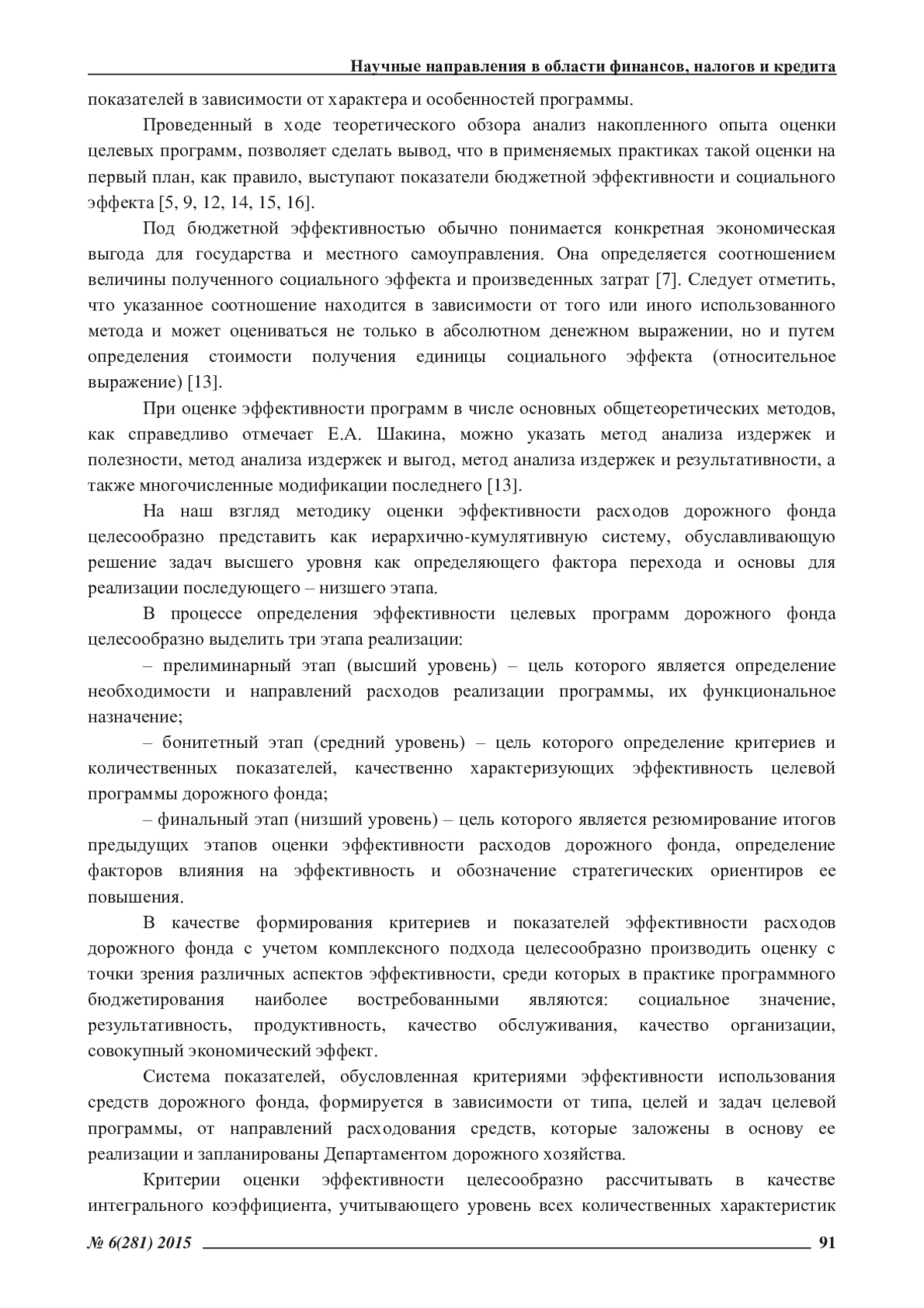 В статье осуществлен анализ существующих подходов к оценке эффективности целевых программ на примере дорожного фонда. Определены основные подходы к разработке методики оценки эффективности целевых программ дорожного фонда: комплексный, интегральный, иерархично-кумулятивный. Предложены критерии определения показателей эффективности целевых программ дорожного фонда с учетом бюджетного, социального, управленческого и экономического эффектов. Обозначены преимущества процесса использования средств дорожного фонда в практике программно-целевого бюджетирования
