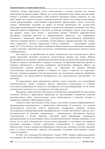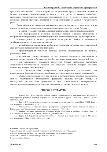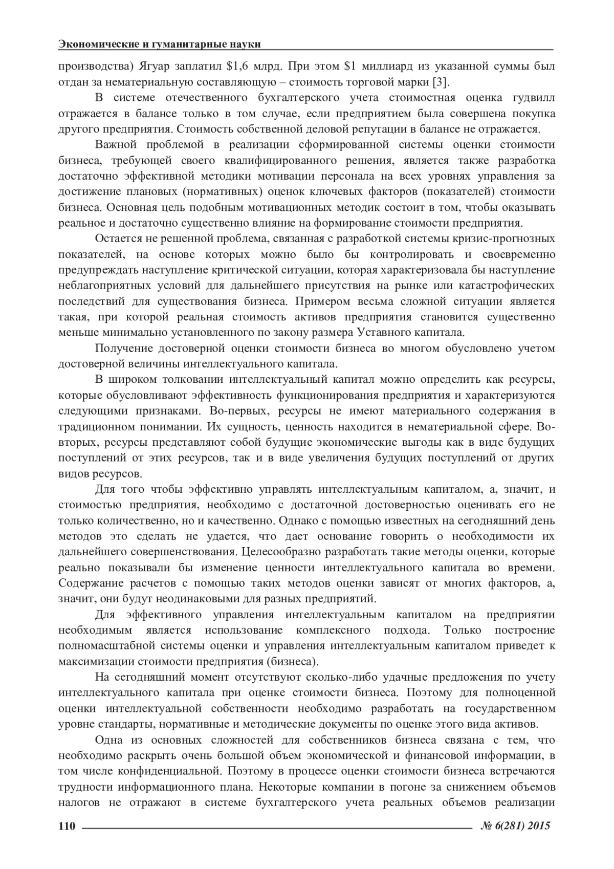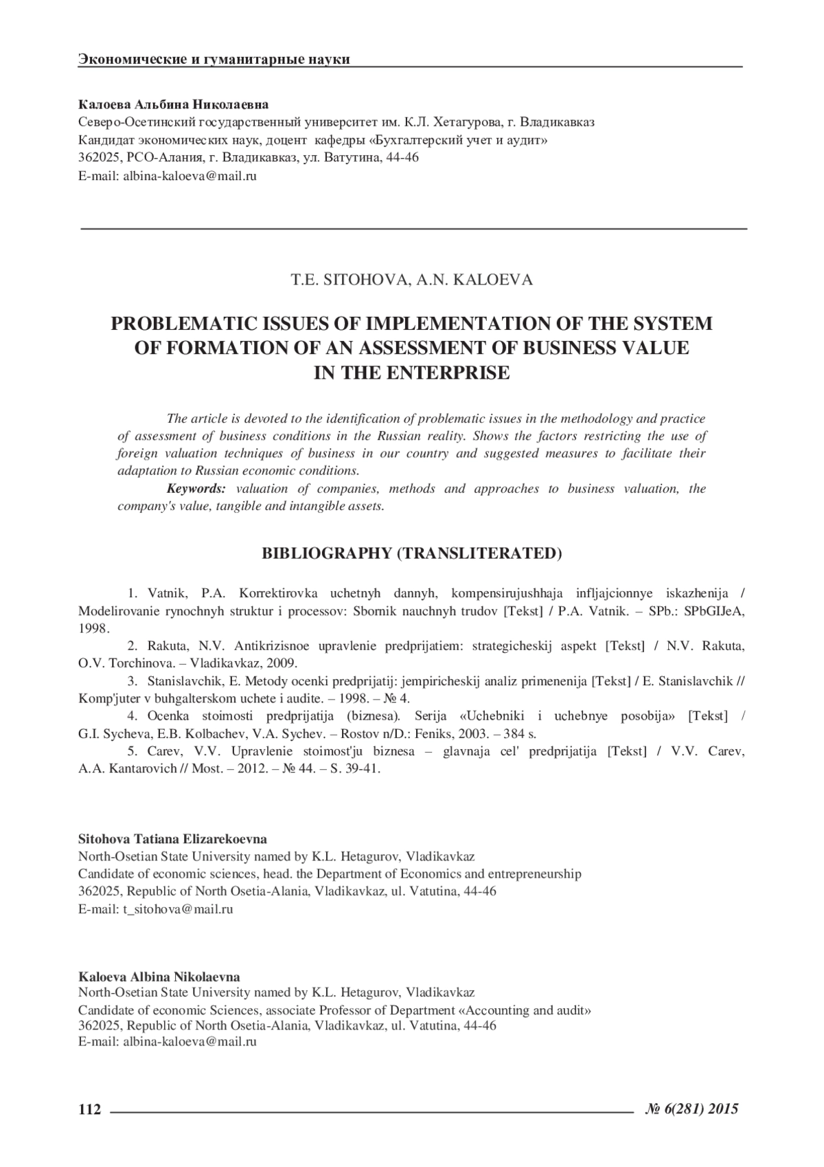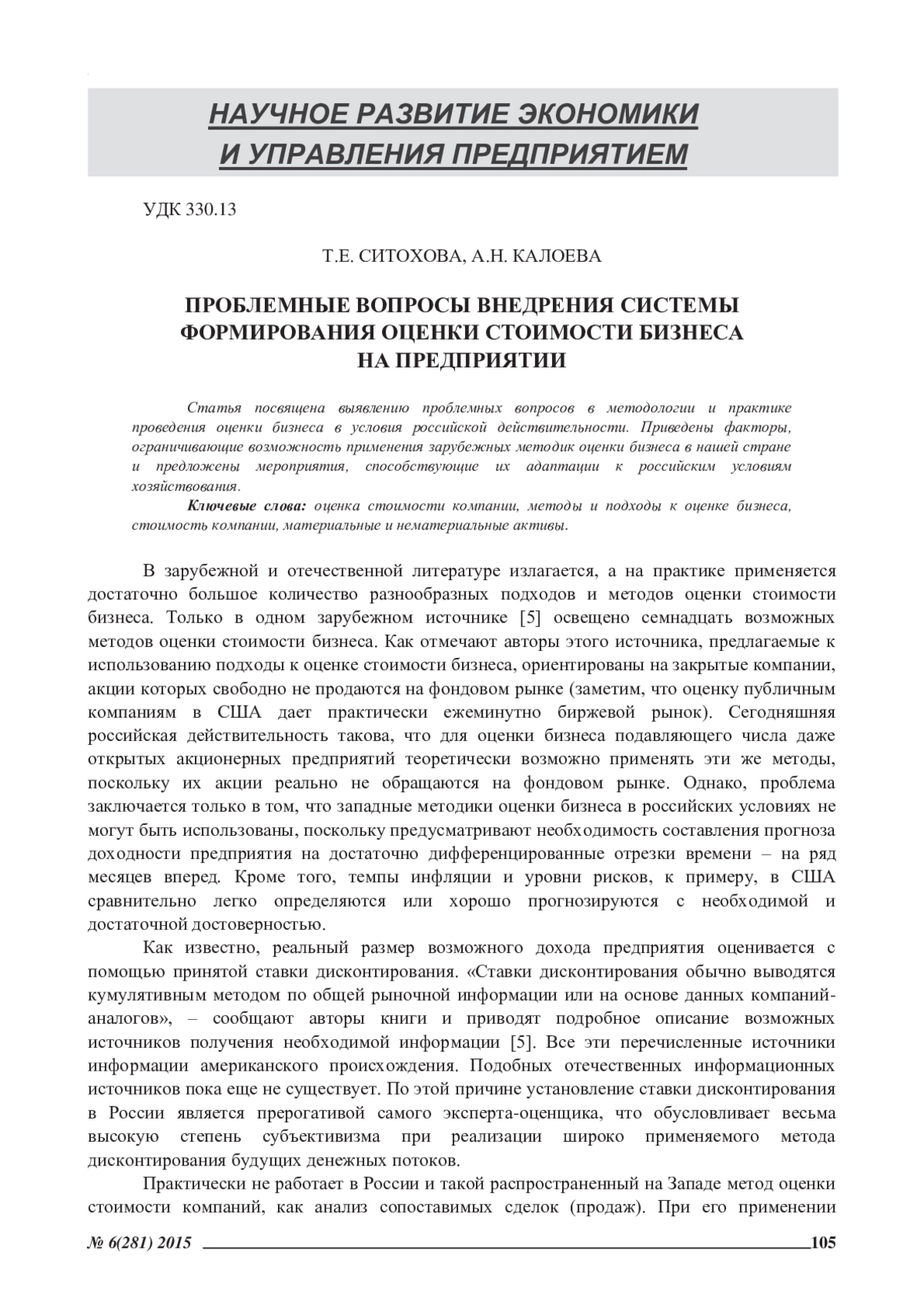 СИТОХОВА Т. Е., КАЛОЕВА А. Н. ПРОБЛЕМНЫЕ ВОПРОСЫ ВНЕДРЕНИЯ СИСТЕМЫ ФОРМИРОВАНИЯ ОЦЕНКИ СТОИМОСТИ БИЗНЕСА НА ПРЕДПРИЯТИИ // ЭКОНОМИЧЕСКИЕ И ГУМАНИТАРНЫЕ НАУКИ. 2015. № 6 (281)