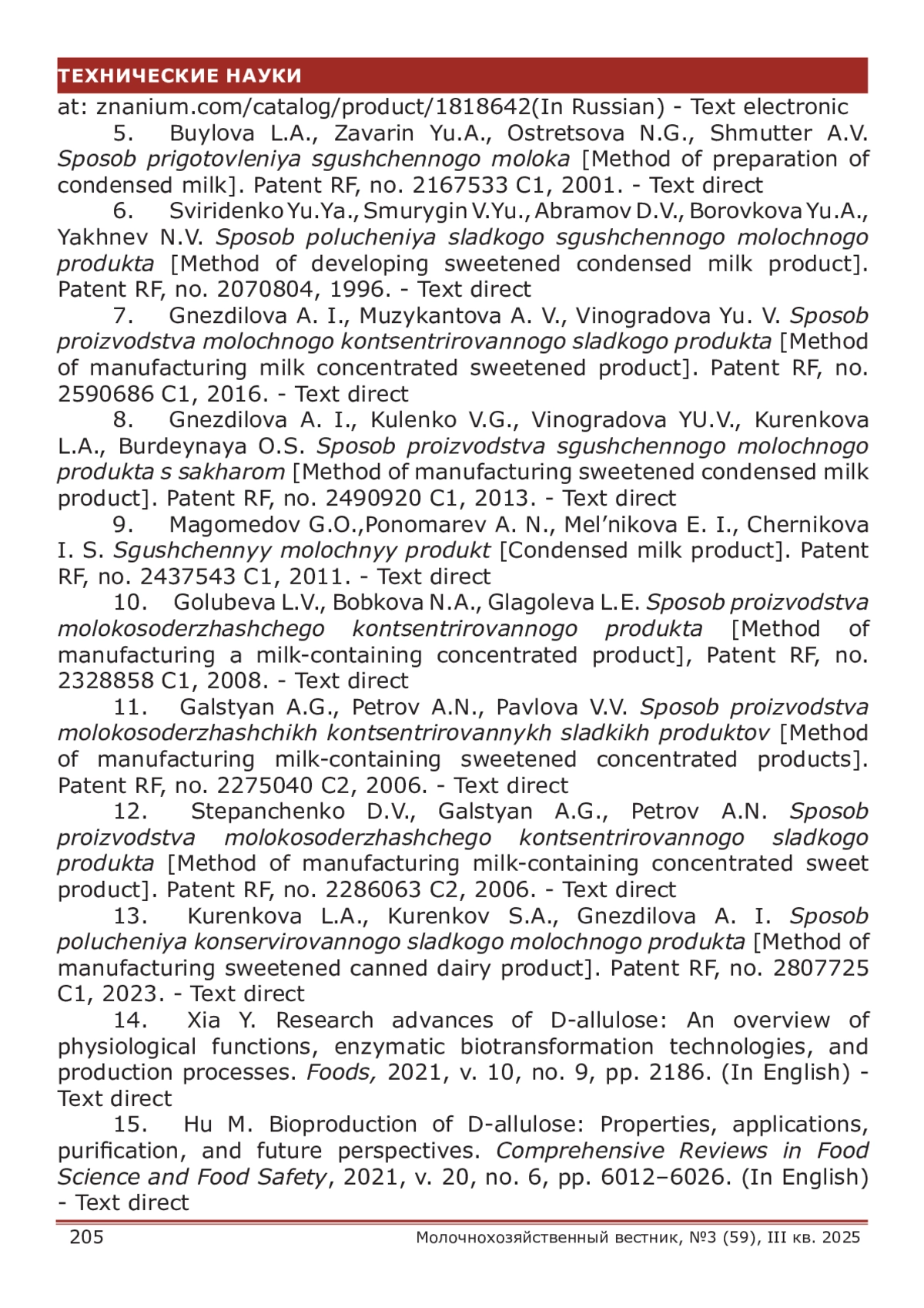 6. Пат. 2070804 С1 РФ, МПК A23C9/18 Способ получения сладкого сгущенного молочного продукта / Ю.Я. Свириденко, В.Ю. Смурыгин, Д.В. Абрамов, Ю.А. Боровкова, Н.В. Яхнев; Всероссийский научно-исследовательский институт маслоделия и сыроделия. -№ 94014660/13, 1994.04.19; опубл. 1996.12.27.