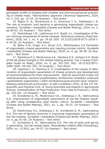 14. Роль пропионовокислых бактерий в формировании органолептических показателей сыров / Г.Н. Рогов, В.А. Мордвинова, Т.С. Смирнова, И.Н. Делицкая // Сыроделие и маслоделие. - 2024. - №2. - С. 60-63.