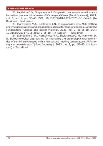 22. Лепилкина, О.В. Ферментативный протеолиз при преобразовании молока в сыр / О.В. Лепилкина, А.И. Григорьева // Пищевые системы. - 2023. - Т. 6. № 1. - С. 36-45. 10.21323/2618-9771-2023-6-1- 36-45. DOI: 10.21323/2618-9771-2023-6-1-36-45