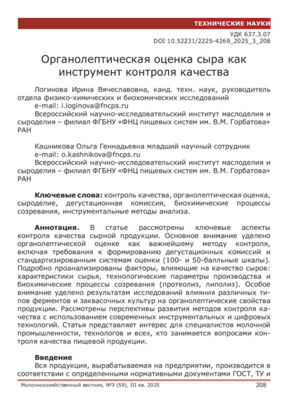 В статье рассмотрены ключевые аспекты контроля качества сырной продукции. Основное внимание уделено органолептической оценке как важнейшему методу контроля, включая требования к формированию дегустационных комиссий и стандартизированным системам оценки (100- и 50-балльные шкалы). Подробно проанализированы факторы, влияющие на качество сыров: характеристики сырья, технологические параметры производства и биохимические процессы созревания (протеолиз, липолиз). Особое внимание уделено результатам исследований влияния различных типов ферментов и заквасочных культур на органолептические свойства продукции. Рассмотрены перспективы развития методов контроля качества с использованием современных инструментальных и цифровых технологий. Статья представляет интерес для специалистов молочной промышленности, технологов и всех, кто занимается вопросами контроля качества пищевой продукции.