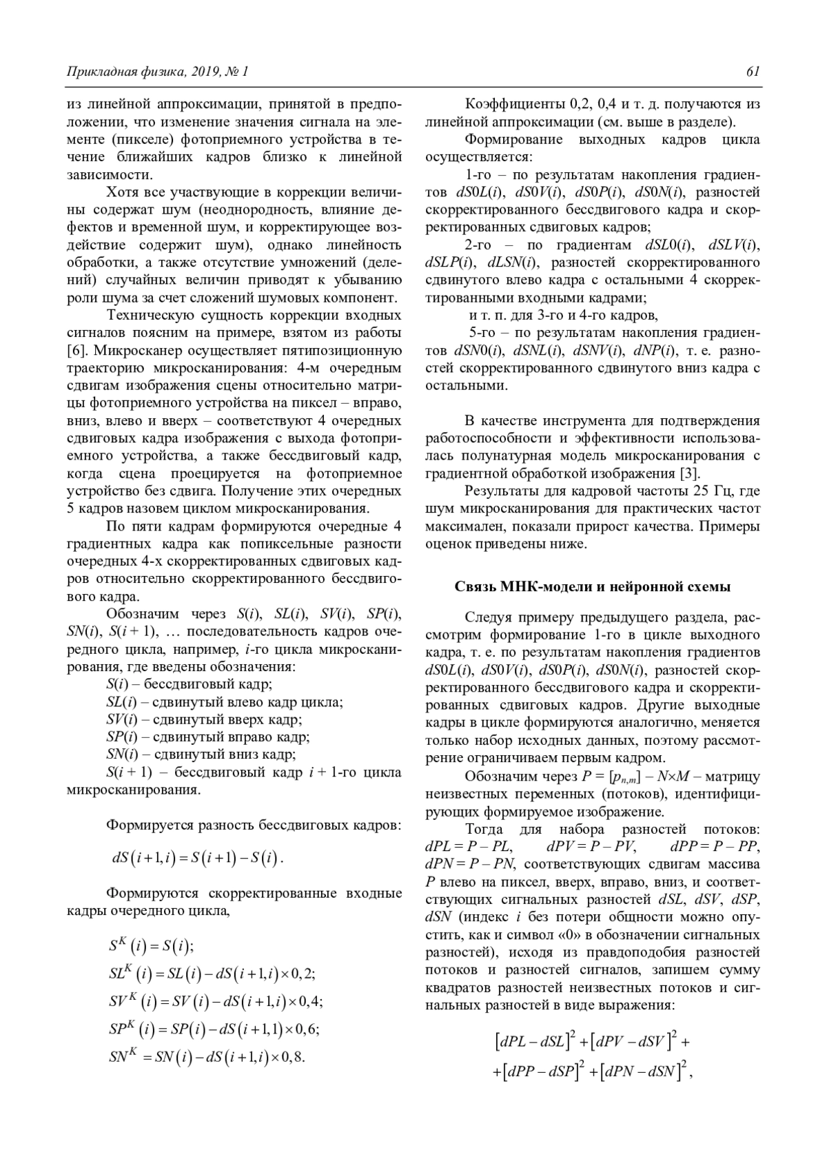 В целом, сформулированная МНК-модель устанавливает место нейронной схемы, задает структуру и пределы качества ее работы. Модель может быть инструментом для разработки и оценки конкретных схем формирования изображения для ФПУ с микросканированием.