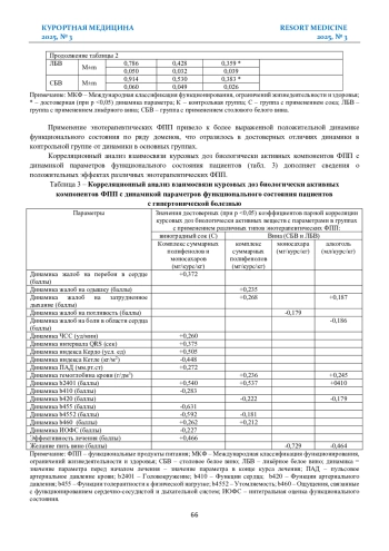 Результаты. Применение виноградного сока обеспечивает большую эффективность лечения и более выраженную положительную динамику 2 доменов МКФ (b2401 и b460). Важно отметить, что потребление моносахаров, содержащихся в виноградном соке, оказалось связано с позитивной динамикой функций сердечно-сосудистой, вегетативной и кроветворной систем. Применение СБВ способствовало большей положительной динамике интегральной оценки функционального состояния и 4 доменов МКФ (b2401, b455, b4552 и b460). Применение ЛБВ способствовало большей положительной динамике 2 доменов МКФ (b455 и b4552).