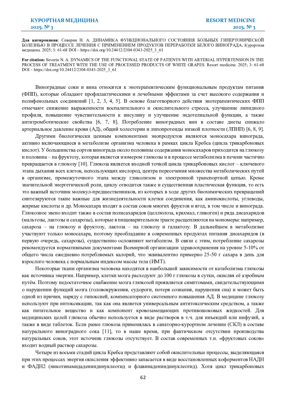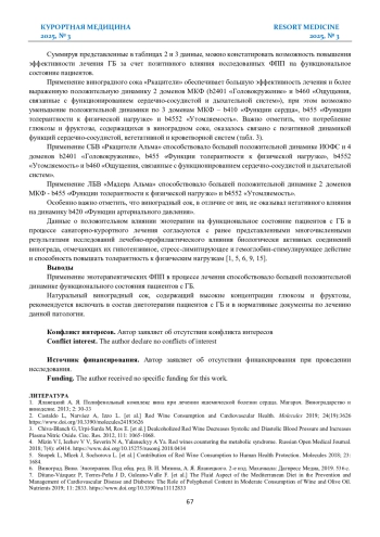 СЕВЕРИН Н. А. ДИНАМИКА ФУНКЦИОНАЛЬНОГО СОСТОЯНИЯ БОЛЬНЫХ ГИПЕРТОНИЧЕСКОЙ БОЛЕЗНЬЮ В ПРОЦЕССЕ ЛЕЧЕНИЯ С ПРИМЕНЕНИЕМ ПРОДУКТОВ ПЕРЕРАБОТКИ БЕЛОГО ВИНОГРАДА // КУРОРТНАЯ МЕДИЦИНА. 2025. № 3