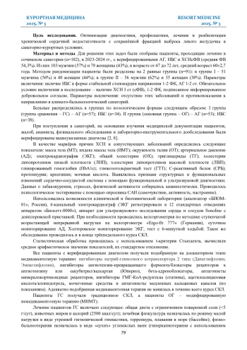 Цель исследования. Оптимизировать диагностику, профилактику и лечение хронической сердечной недостаточности с сохранённой фракцией выброса левого желудочка (ХСНсФВ) в условиях санаторно-курортного лечения (СКЛ).