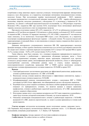 Выводы. Показана предпочтительность методики спекл-трекинг-эхокардиографии по сравнению с фракцией выброса левого желудочка для оценки сократимости миокарда в динамике. Доказано, что использование УНКП улучшает результаты санаторно-курортного лечения данной категории больных.