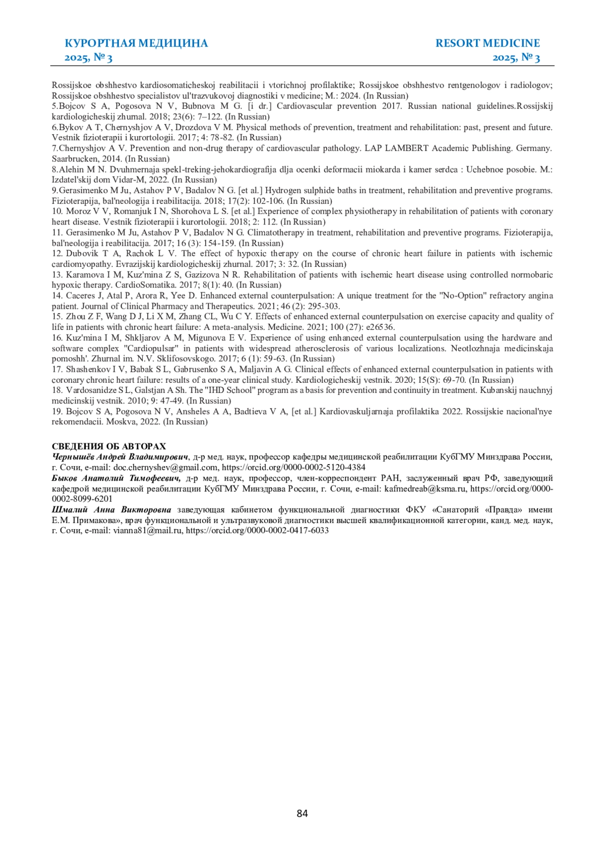 10. Мороз В. В., Романюк И. Н., Шорохова Л. С. [и др.] Опыт комплексной физиотерапии в реабилитации больных ишемической болезнью сердца. Вестник физиотерапии и курортологии. 2018; 2: 112.