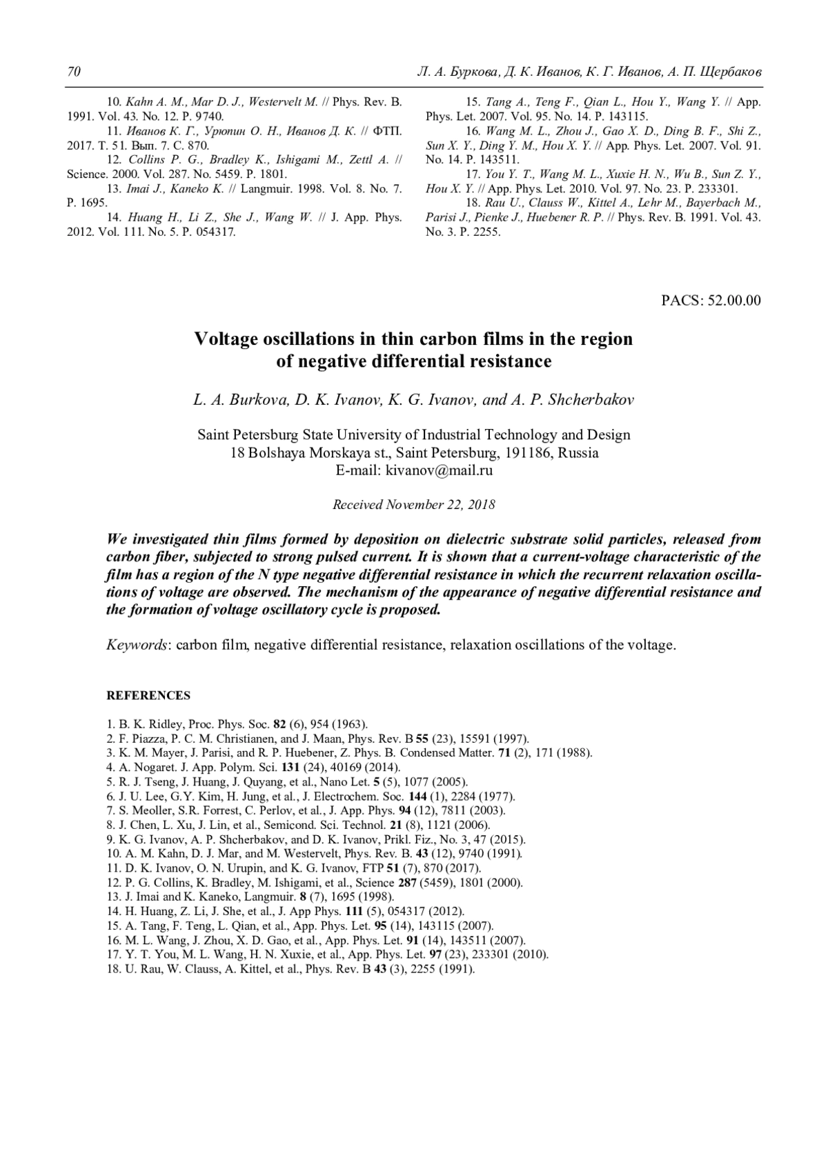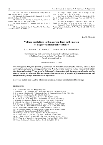 L. A. Burkova, D. K. Ivanov, K. G. Ivanov, and A. P. Shcherbakov Voltage oscillations in thin carbon films in the region of negative differential resistance 66