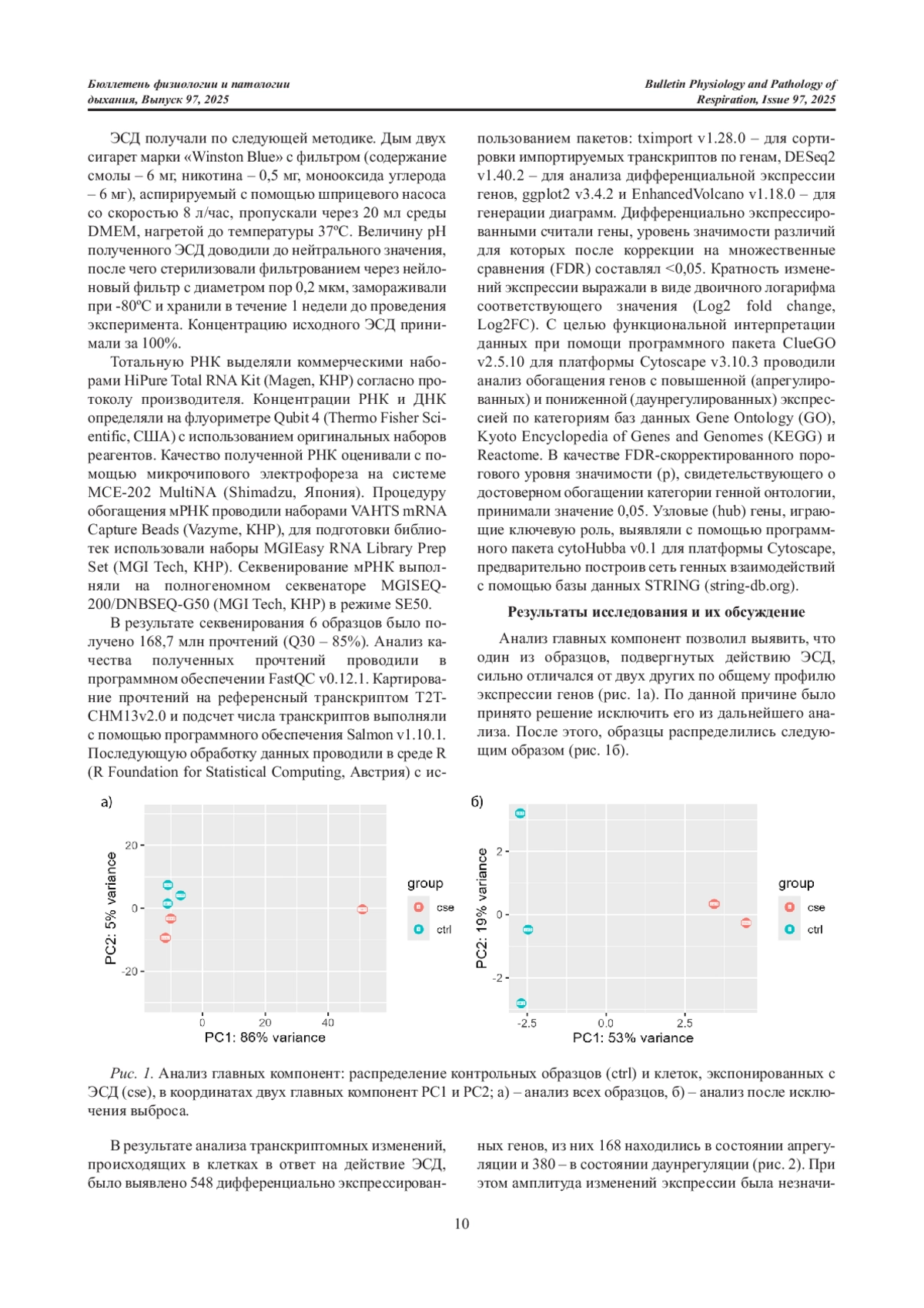 Введение. Хроническая обструктивная болезнь легких (ХОБЛ) – распространенное заболевание с высокой социальной значимостью, в патогенезе которого существенную роль может играть реакция альвеолярного эпителия на сигаретный дым. Цель. Комплексная характеристика транскриптомных изменений в клетках A549, возникающих в ответ на действие экстракта сигаретного дыма (ЭСД), включая анализ дифференциальной экспрессии генов и ключевых сигнальных путей, с оценкой их потенциальной роли в развитии патологического процесса при ХОБЛ. Материалы и методы. Клетки A549 выращивали в среде DMEM до 80% конфлюэнтности, а затем инкубировали с 5% ЭСД или в контрольных условиях в течение 24 часов (n = 3 на каждое условие). Выделенную тотальную РНК подвергали обогащению для получения мРНК. Секвенирование выполняли на секвенаторе MGISEQ-200 в режиме SE50. Обработка данных включала картирование прочтений (Salmon), анализ дифференциальной экспрессии (DESeq2) и функционального обогащения генов (Cytoscape). Результаты. Действие ЭСД сопровождалось признаками дезорганизации актинового цитоскелета (ингибирование Rho ГТФаз, даунрегуляция ACTB) и стресса эндоплазматического ретикулума с парадоксальной активацией mTORC1 сигналинга на фоне подавления транскрипции, пролиферации и апоптоза, что в совокупности может быть охарактеризовано как метаболически активный клеточный стазис. Одновременно с этим отмечалось усиление протеасомной деградации и антигенной презентации собственных, вероятно, дефектных белков с целью стимуляции иммунологического надзора. В то время как провоспалительный сигналинг, в целом, был ослаблен, увеличивалась экспрессия IL1A, SPP1 и CSF3, что может способствовать привлечению и активации нейтрофилов, макрофагов и моноцитов in vivo. Предполагаемые нарушения эффероцитоза (за счет апрегуляции ANXA5) и индукции апоптоза цитотоксическими Tклетками (вследствие нарушения эндоцитоза гранзимов и ингибирования каспаз) могут приводить к формированию хронического воспаления с аутоиммунным компонентом. Заключение. Активация mTORC1 сигналинга и презентации аутоантигенов на фоне стресса эндоплазматического ретикулума, а также потенциальное снижение способности цитотоксических T-клеток вызывать апоптоз, может являться ключевыми механизмами патогенеза ХОБЛ, опосредующими повреждение альвеолярного эпителия под действием сигаретного дыма.