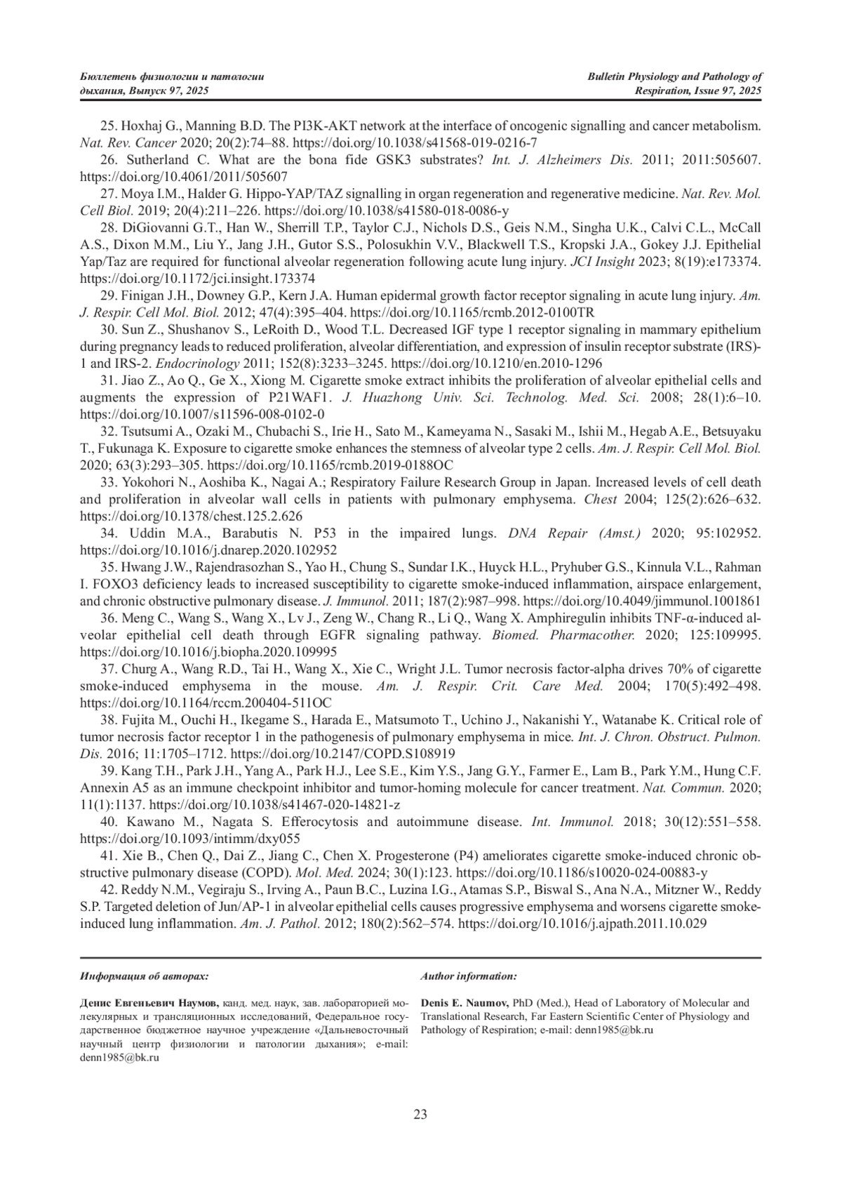 32. Tsutsumi A., Ozaki M., Chubachi S., Irie H., Sato M., Kameyama N., Sasaki M., Ishii M., Hegab A.E., Betsuyaku T., Fukunaga K. Exposure to cigarette smoke enhances the stemness of alveolar type 2 cells // Am. J. Respir. Cell Mol. Biol. 2020. Vol.63, Iss.3. P.293-305. DOI: 10.1165/rcmb.2019-0188OC