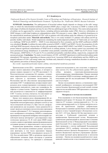 Введение. Патогенетические механизмы формирования бронхиальной астмы (БА) во многом основаны на процессах изменения энергетического состояния клеток (в том числе иммунной системы), большую роль в котором играет состояние митохондриального мембранного потенциала (ММП). Снижение последнего проявляется уже на ранних этапах развития БА и может являться одним из ключевых признаков ее течения. Течение и прогрессирование БА способны усугубляться под влиянием разных факторов, в том числе твердых взвешенных частиц (ТВЧ) атмосферного воздуха. Однако сведения об изменении ММП в отдельных лимфоцитарных субпопуляциях при БА под воздействием ТВЧ практически отсутствуют. Цель. Установление нарушений мембранного потенциала митохондрий CD4+ клеток больных бронхиальной астмой легкой степени тяжести под воздействием ТВЧ приземного слоя атмосферного воздуха. Материалы и методы. В исследование in vitro были включены образцы периферической крови 131 больных БА и 60 условно здоровых лиц. В качестве нагрузки при проведении эксперимента использовали модельные взвеси веществ, имитирующие многокомпонентное загрязнение атмосферного воздуха г. Владивостока. Уровни интенсивности нарушений ММП (от 1 до 5) CD4+ определяли методом проточной цитофлуориметрии. При анализе использовали коэффициент ММП (кММП). Результаты. При БА основные перестройки процентного соотношения лимфоцитарной субпопуляции происходили среди клеток, имеющих уровни ММП-1, ММП-2 и ММП-3: наблюдалось уменьшение количества клеток с высоким ММП и увеличение числа CD4+, характеризующихся снижением структурно-функциональных свойств (ММП-2 и ММП-3). Воздействие ТВЧ вызывало перераспределение клеток между уровнями ММП у больных БА. При снижении контроля БА были установлены более выраженные нарушения энергетического состояния клеток. У больных при контролируемом течении БА по сравнению с частично контролируемом кММП был ниже на 82,9%. При воздействии ТВЧ на больных БА кММП снижался относительно групп без нагрузки на 27,2% и 16,3% при контролируемом и частично контролируемом течении соответственно. Заключение. Установлены особенности нарушения мембранного потенциала митохондрий CD4+ клеток больных бронхиальной астмой легкой степени тяжести под воздействием ТВЧ приземного слоя атмосферного воздуха в зависимости от уровня контроля заболевания. Оценка перераспределения уровней ММП и коэффициента ММП как интегрального показателя энергетического состояния CD4+ клеток может способствовать раннему выявлению нарушений энергетического обмена при БА, что позволит оптимизировать профилактику прогрессирования патологии.