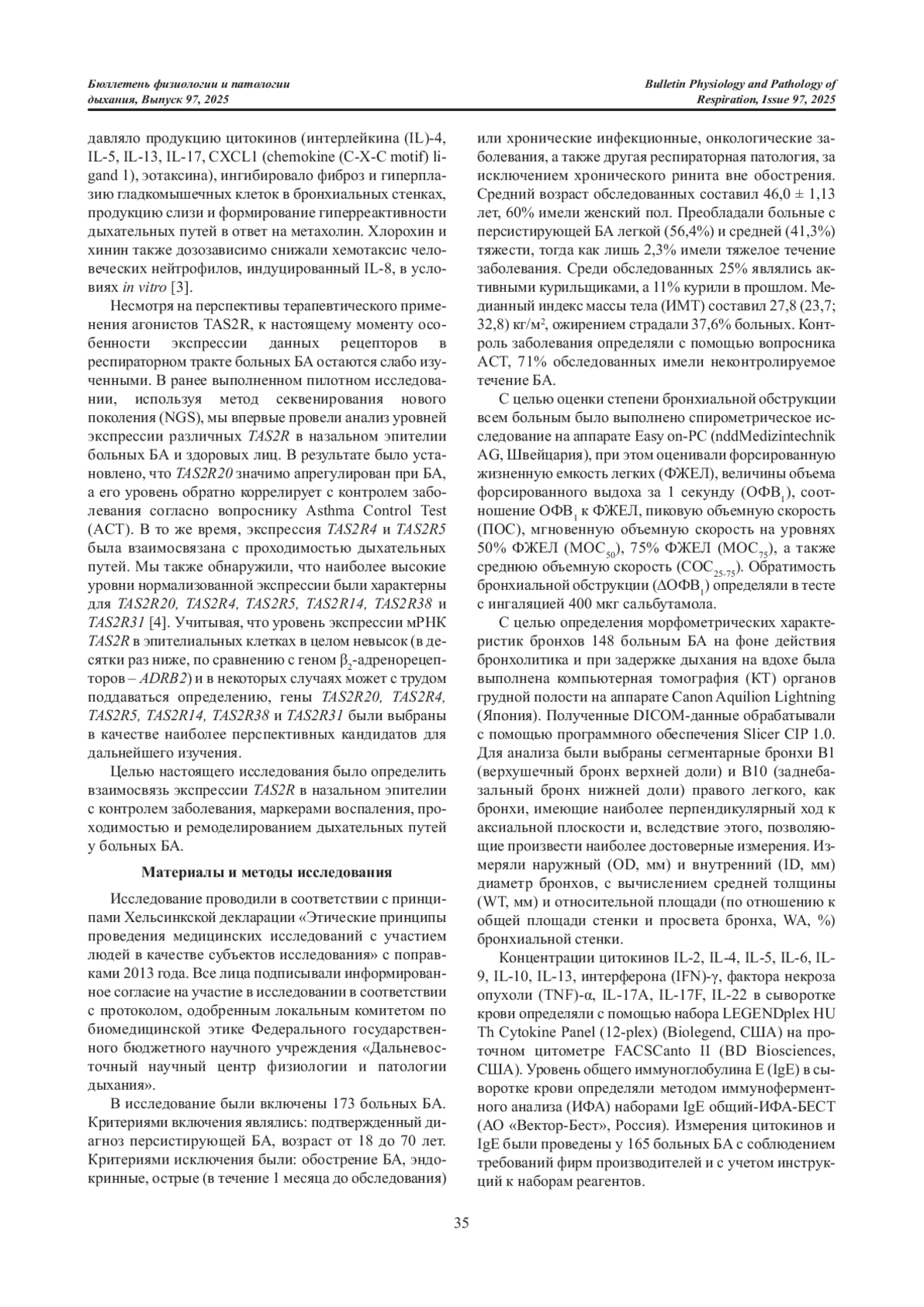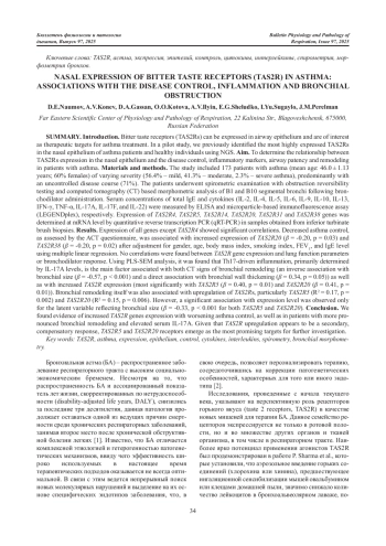 Введение. Рецепторы горького вкуса (TAS2R) могут экспрессироваться в эпителии дыхательных путей и представляют интерес как терапевтические мишени для лечения бронхиальной астмы (БА). Ранее в ходе пилотного исследования мы идентифицировали наиболее экспрессируемые TAS2R в назальном эпителии больных БА и здоровых лиц методом секвенирования нового поколения (NGS). Цель. Определить взаимосвязь экспрессии TAS2R в назальном эпителии с контролем заболевания, маркерами воспаления, проходимостью и ремоделированием дыхательных путей у больных БА. Материалы и методы. В исследование было включено 173 больных БА (46,0 ± 1,13 лет, 60% женщины) различной тяжести (56,4% – легкая БА, 41,3% – среднетяжелая БА, 2,3% – тяжелая БА), преимущественно – с неконтролируемым течением заболевания (71%). Пациентам выполняли спирометрическое исследование с тестом на обратимость бронхиальной обструкции и морфометрию сегментарных бронхов B1 и B10 по данным компьютерной томографии (КТ) на фоне бронхолитика. Сывороточные концентрации общего IgE и цитокинов (интерлейкина (IL)-2, IL-4, IL-5, IL-6, IL-9, IL-10, IL-13, интерферона γ, фактора некроза опухоли α, IL-17A, IL-17F, IL-22) измеряли методами иммуноферментного и иммунофлуоресцентного анализа на микрочастицах (LEGENDplex), соответственно. Экспрессию генов TAS2R4, TAS2R5, TAS2R14, TAS2R20, TAS2R31 и TAS2R38 определяли на уровне мРНК методом количественной ПЦР с обратной транскрипцией в образцах, полученных из браш-биоптатов нижней носовой раковины. Результаты. Экспрессия всех генов, за исключением TAS2R4, была взаимосвязана. Снижение контроля БА по данным вопросника ACT сопровождалось увеличением экспрессии TAS2R20 (β = -0,20, p = 0,03) и TAS2R38 (β = -0,20, p = 0,02) после коррекции на пол, возраст, индекс массы тела, индекс курения, величину объема форсированного выдоха за 1 секунду и уровень IgE методом множественной линейной регрессии. Показатели вентиляционной функции легких и реакции на бронхолитик не были взаимосвязаны с экспрессией генов TAS2R. С помощью анализа PLS-SEM было установлено, что Th17 воспаление, преимущественно определяемое уровнем IL-17A, является основным фактором, ассоциированным как с КТ-признаками ремоделирования бронхов (обратная ассоциация с размерами бронхов – β = -0,57, p < 0,001; прямая – с утолщением бронхиальной стенки – β = 0,34, p = 0,05), так и с повышенной экспрессией TAS2R (наиболее существенно – с TAS2R5 β = 0,40, p = 0,01 и TAS2R20 β = 0,41, p = 0,01). Само ремоделирование бронхов также сочеталось с апрегуляцией TAS2R, в особенности, TAS2R5 (R2 = 0,17, p = 0,002) и TAS2R20 (R2 = 0,15, p = 0,006), при этом значимая ассоциация с экспрессией прослеживалась только для латентной переменной, отражающей размеры бронхов (β = -0,33, p < 0,001 – как для TAS2R5, так и для TAS2R20). Заключение. Мы обнаружили признаки увеличения экспрессии генов TAS2R при снижении контроля БА, а также у пациентов с более выраженным бронхиальным ремоделированием и повышенным уровнем IL-17A в сыворотке крови. При условии, что индукция TAS2R носит вторичный, компенсаторный характер, рецепторы TAS2R5 и TAS2R20 представляют интерес как наиболее перспективные объекты для дальнейшего изучения.