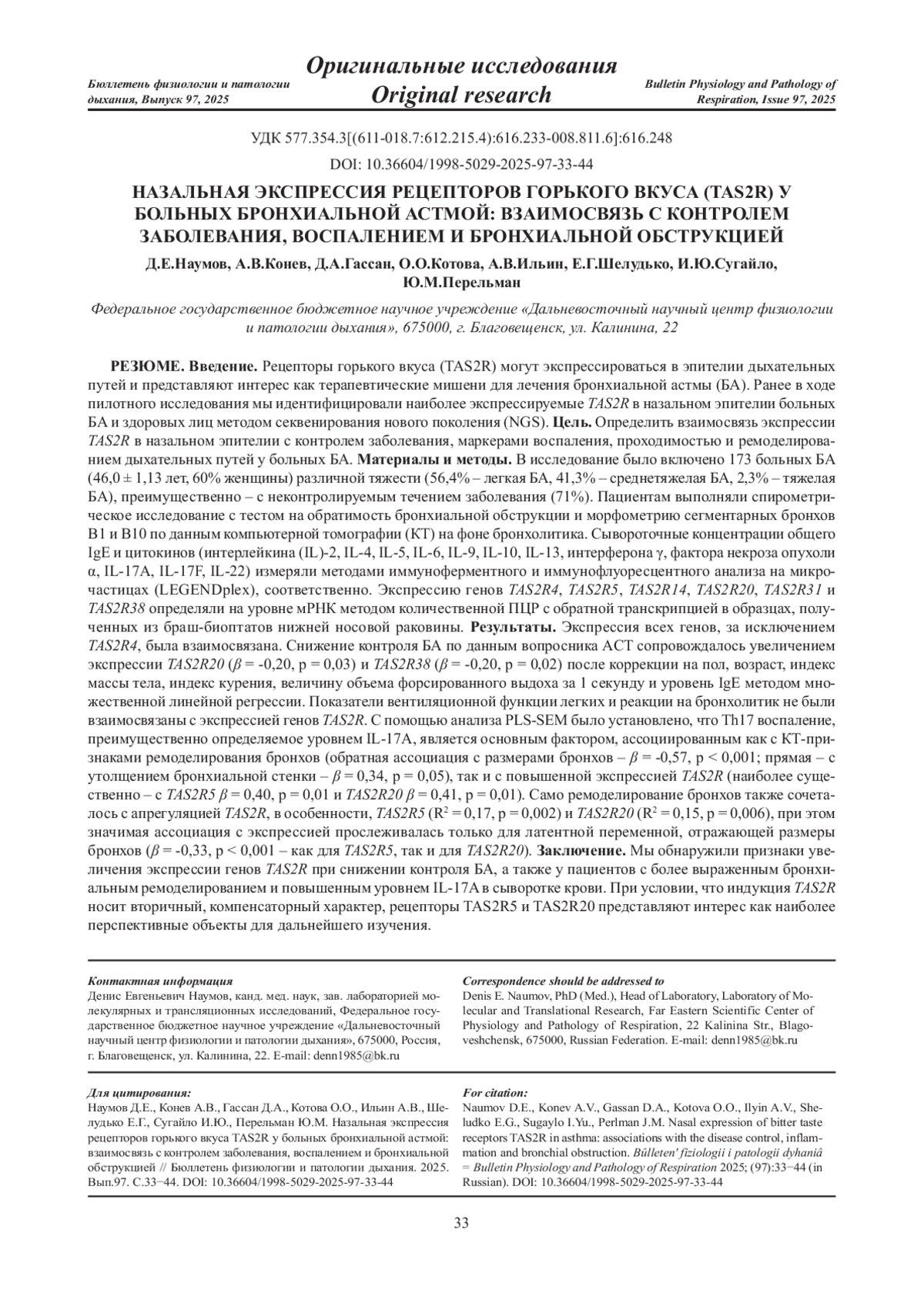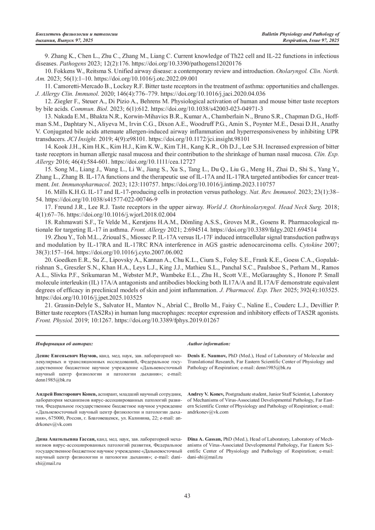 4. Наумов Д.Е., Гассан Д.А., Котова О.О., Шелудько Е.Г., Афанасьева Е.Ю., Конев А.В., Перельман Ю.М. Анализ экспрессии рецепторов горького вкуса TAS2R в назальном эпителии больных бронхиальной астмой методом секвенирования нового поколения // Бюллетень физиологии и патологии дыхания. 2025. Вып.95. С.8-17. DOI: 10.36604/1998-5029-2025-95-8-17