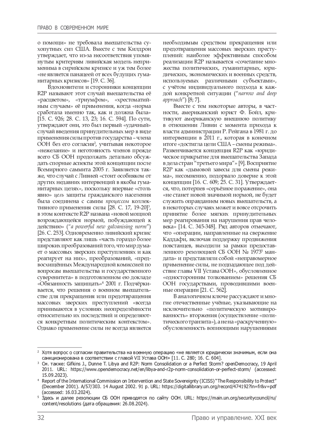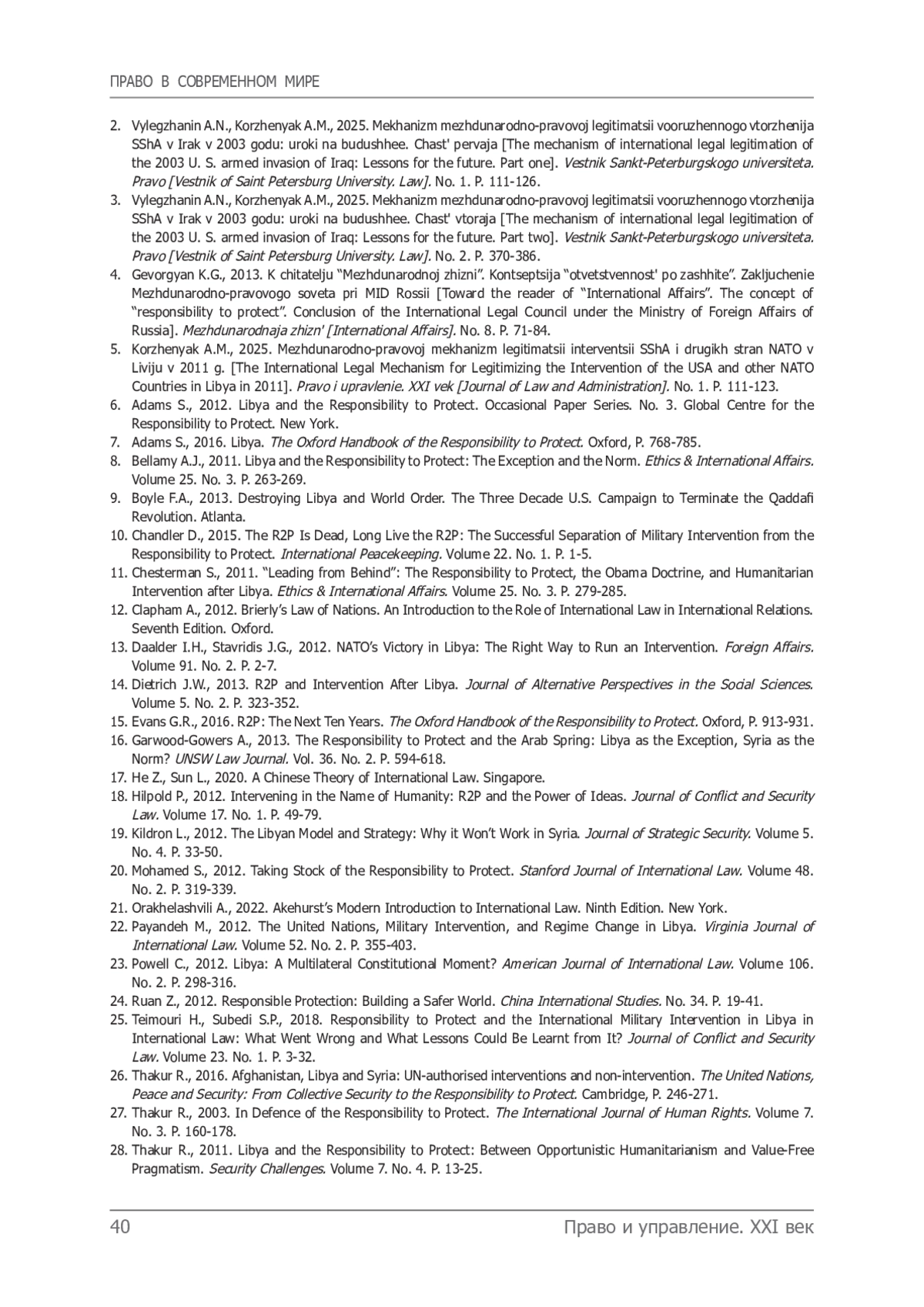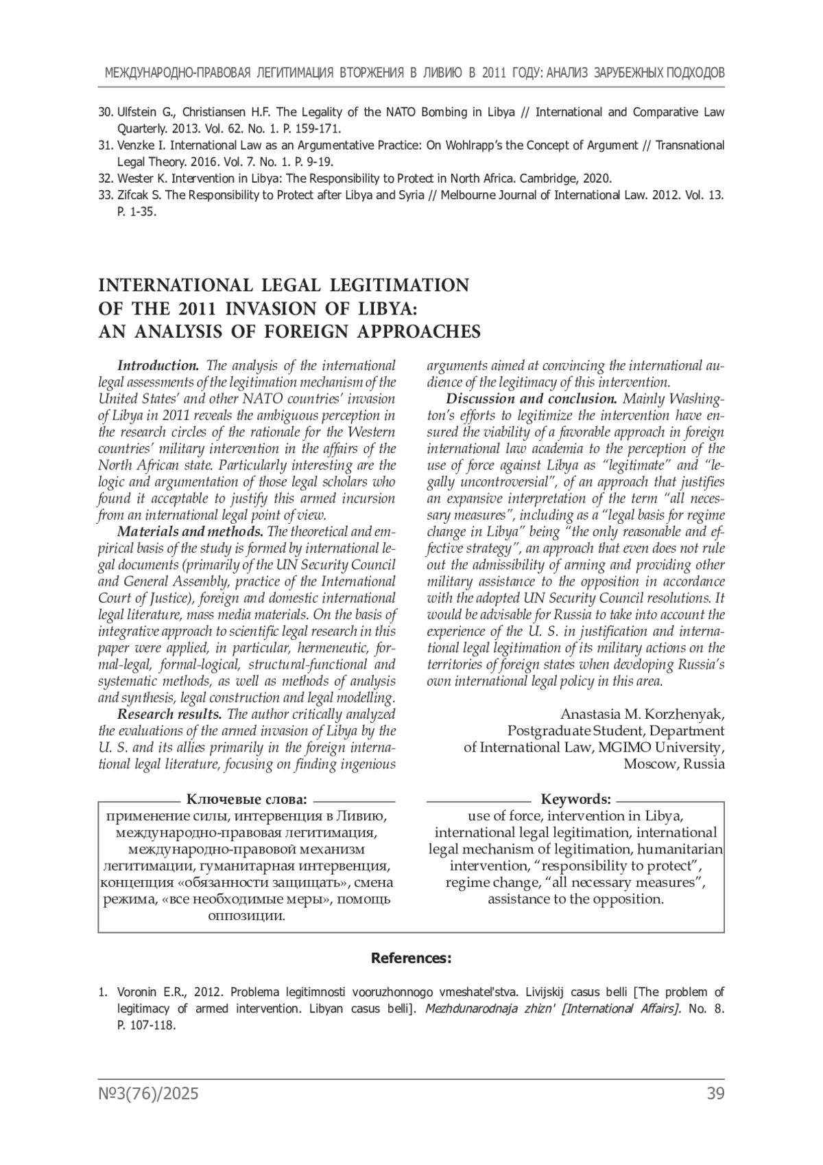 КОРЖЕНЯК А. М. МЕЖДУНАРОДНО-ПРАВОВАЯ ЛЕГИТИМАЦИЯ ВТОРЖЕНИЯ В ЛИВИЮ В 2011 ГОДУ: АНАЛИЗ ЗАРУБЕЖНЫХ ПОДХОДОВ // ПРАВО И УПРАВЛЕНИЕ. XXI ВЕК. 2025. ТОМ 21, № 3