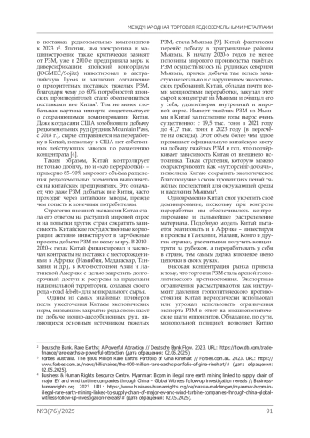 Обсуждение и заключение. Экономические и политические интересы, торговые войны как их следствие, вооруженные конфликты, высокая географическая и функциональная концентрация РЗМ напрямую влияют на глобальные цепочки поставок, побуждают страны к борьбе с целью контроля над источниками РЗМ. Дальнейший рост конкуренции за ресурсы РЗМ приводит к созданию новых производственных мощностей по их добыче и переработке в разных регионах мира, что способствует появлению в перспективе более сбалансированного рынка и формированию многополярной системы международной торговли, ослаблению мировой зависимости от влияния Китая как ведущего поставщика и координирующего центра глобальных поставок РЗМ.
