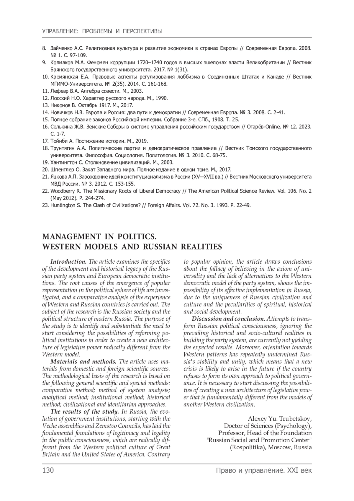 Обсуждение и заключение. Попытки трансформации российского политического сознания, игнорирующие сложившиеся исторические, социокультурные реалии при построении партийной системы, на сегодняшний день не приносят ожидаемых результатов. Более того, ориентация на западные шаблоны уже не раз подрывала стабильность и единство России, что означает вероятность возникновения нового кризиса в будущем, если страна откажется от формирования своего подхода к управлению в политике. Необходимо начать обсуждение возможностей создания новой архитектуры законодательной власти в корне отличной от моделей иной нам Западной цивилизации.