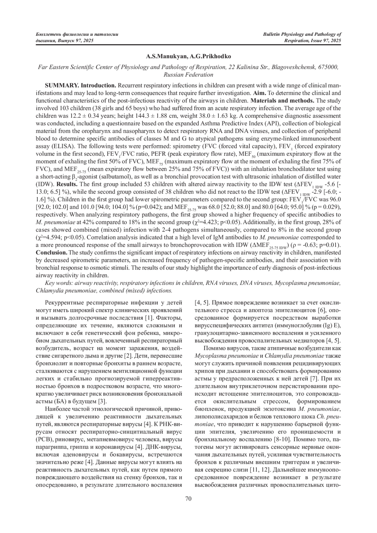 Введение. Рекуррентные респираторные инфекции у детей могут иметь широкий спектр клинических проявлений и вызывать долгосрочные последствия, которые требуют дополнительного изучения. Цель: определить клинико-функциональные особенности течения постинфекционной реактивности дыхательных путей у детей. Материалы и методы. В исследовании приняли участие 103 ребенка (38 девочек и 65 мальчиков), перенесших острую респираторную инфекцию. Средний возраст детей составил 12,2 ± 0,34 лет; рост 144,3 ± 1,88 см, вес 38,0 ± 1,63 кг. Детям проведена комплексная диагностика, включая анкетирование по расширенному опроснику API (Astma Predictive Index), забор биологического материала из рото- и носоглотки с целью обнаружения респираторных РНК- и ДНК-вирусов, забор периферической крови для определения специфических антител класса M и G к атипичным возбудителям методом иммуноферментного анализа. Были выполнены: спирометрия (ЖЕЛ (жизненная емкость легких), ОФВ1 (объем форсированного выдоха за первую секунду), соотношение ОФВ1/ЖЕЛ, ПОС (пиковая объемная скорость выдоха), МОС50 (максимальная объемная скорость в момент выдоха первых 50% ФЖЕЛ), МОС75 (максимальная объемная скорость в момент выдоха первых 75% ФЖЕЛ), СОС25-75 (средняя объемная скорость между 25% и 75% объема ФЖЕЛ)) с проведением ингаляционной бронходилатационной пробы с β2-агонистом короткого действия (сальбутамол), а также бронхопровокационная проба с ультразвуковой ингаляцией дистиллированной воды (ИДВ). Результаты. В первую группу были включены 53 ребенка с измененной реактивностью дыхательных путей на пробу ИДВ (ΔОФВ1 идв -5,6 [-13,0; 6,5])%, а во 2 группу – 38 детей, не реагирующих на пробу с ИДВ (ΔОФВ1 идв -2,9[-6,0; -1,6]%. Дети 1 группы имели более низкие значения спирометрических параметров в сравнении со 2 группой: ОФВ1/ЖЕЛ составил 96,0 [92,0; 102,0] и 101,0 [94,0; 104,0]% (p = 0,042); СОС25-75 68,0 [52,0; 88,0] и 80, 0[64,0; 95,0]% (p = 0,029), соответственно. При анализе респираторных возбудителей в 1 группе, относительно 2 группы, прослеживалась более высокая частота выявления специфических антител к Mycoplasma pneumoniae 42 и 18% (χ2 = 4,423; p < 0,05), соответственно. Кроме того, у детей 1 группы в 28% случаев определялось сочетанное инфицирование 2–4 возбудителями одновременно, в сравнении с детьми 2 группы – 8% случаев (χ2 = 4,594; p < 0,05). По результатам корреляционного анализа высокому уровню IgM к M. pneumonia соответствовал более выраженный ответ мелких дыхательных путей на бронхопровокацию ИДВ (ΔСОС25-75 ИДВ) (ρ = -0,63; p = 0,01). Заключение. Проведённое исследование подтверждает значительное влияние респираторных инфекций на реактивность дыхательных путей у детей, что проявляется в снижении спирометрических параметров, повышенной частоте выявления патогенспецифических антител и их связи с реакцией бронхов на осмотический стимул. Результаты нашего исследования подчёркивают важность ранней диагностики постинфекционной реактивности дыхательных путей у детей.