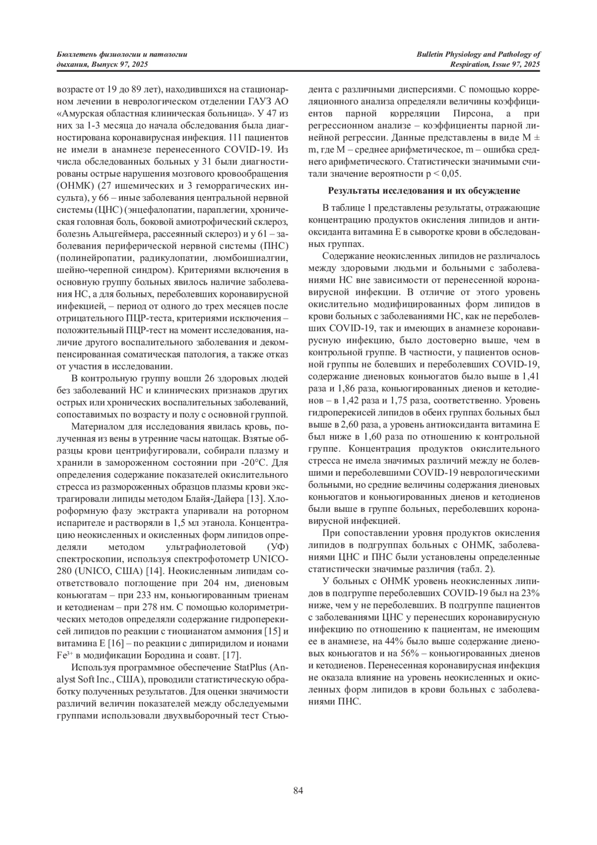 Введение. Коронавирусная инфекция сопровождается разнообразными осложнениями со стороны нервной системы, в развитии которых определенная роль принадлежит окислительному стрессу и воспалению. Цель – выяснение связи между перенесенной коронавирусной инфекцией и содержанием продуктов окислительного стресса и провоспалительных интерлейкинов у больных с заболеваниями нервной системы. Материалы и методы. В исследовании приняли участие 158 больных с заболеваниями нервной системы. Из них 47 имели в анамнезе COVID-19. Контрольную группу составили 26 человек без клинических признаков острых и хронических заболеваний, сопоставимых по возрасту и полу. Концентрацию в крови неокисленных и окисленных форм липидов определяли с помощью УФ-спектроскопии, содержание гидроперекисей липидов и витамина Е – колориметрическим методом. Результаты. Содержание продуктов окислительного стресса в крови больных с заболеваниями нервной системы увеличено по отношению к здоровым людям, но значимых различий между пациентами, перенесшими коронавирусную инфекцию и не переболевшими ею, не было выявлено. Только в подгруппе больных с заболеваниями центральной нервной системы у перенесших коронавирусную инфекцию по отношению к пациентам, не имеющим ее в анамнезе, на 44% было выше содержание диеновых коньюгатов (p = 0,019), и на 56% – коньюгированных диенов и кетодиенов (р = 0,050). Содержание в крови продуктов окисления липидов различалось между подгруппами больных с острыми нарушениями мозгового кровообращения, заболеваниями центральной и периферической нервной системы. У больных с острыми нарушениями мозгового кровообращения, не имеющих в анамнезе COVID-19, по отношению к больным с заболеваниями центральной нервной системы содержание диеновых коньюгатов было выше на 81% (р = 0,032), коньюгированных диенов и кетодиенов – на 72% (0,042), а гидроперекисей липидов – на 45% (р = 0,016). У больных, перенесших COVID-19, уровень гидроперекисей липидов в подгруппе с острыми нарушениями мозгового кровообращения (80,0 ± 9,37 нмоль/мл) был выше на 37% (р = 0,03) и 32% (р = 0,03) по отношению к подгруппам с заболеваниями центральной и периферической нервной системы, в которых он составил 59,9 ± 7,07 нмоль/мл и 62,2 ± 3,6 нмоль/мл, соответственно. Сильные корреляции между уровнем в крови провоспалительных интерлейкинов и окислительно модифицированных липидов у больных, перенесших COVID-19, наиболее характерны для интерлейкинов 6 и 10. Заключение. Умеренные проявления окислительного стресса у больных с заболеваниями нервной системы в значительной мере обусловлены основным заболеванием, а не перенесенной коронавирусной инфекцией. В постковидном периоде у обследованных больных, переболевших COVID-19, сохраняется связь между проявлениями окислительного стресса и воспаления.