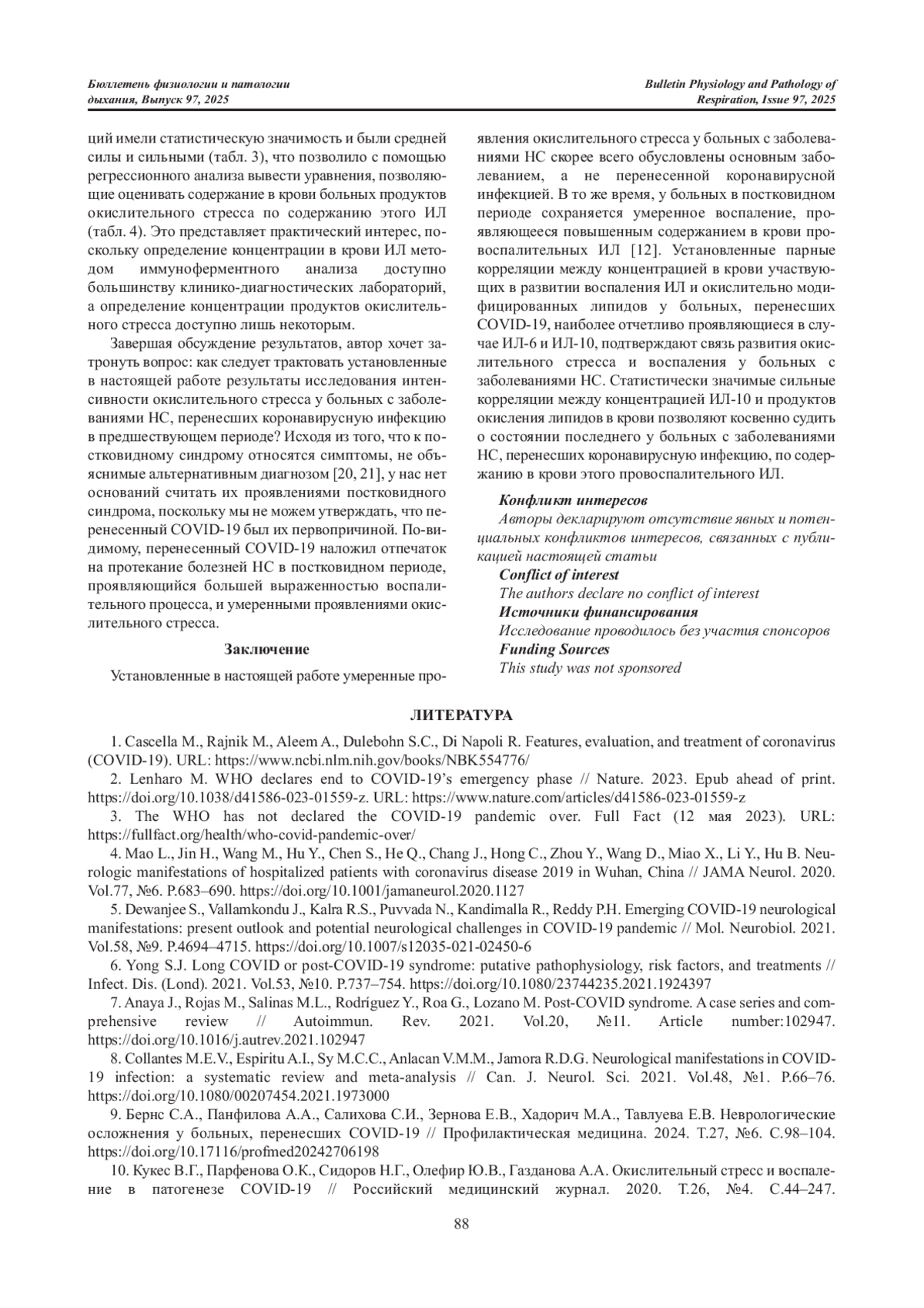 10. Кукес В.Г., Парфенова О.К., Сидоров Н.Г., Олефир Ю.В., Газданова А.А. Окислительный стресс и воспаление в патогенезе COVID-19 // Российский медицинский журнал. 2020. Т.26, №4. С.44-247. DOI: 10.17816/0869-2106-2020-26-4-244-247