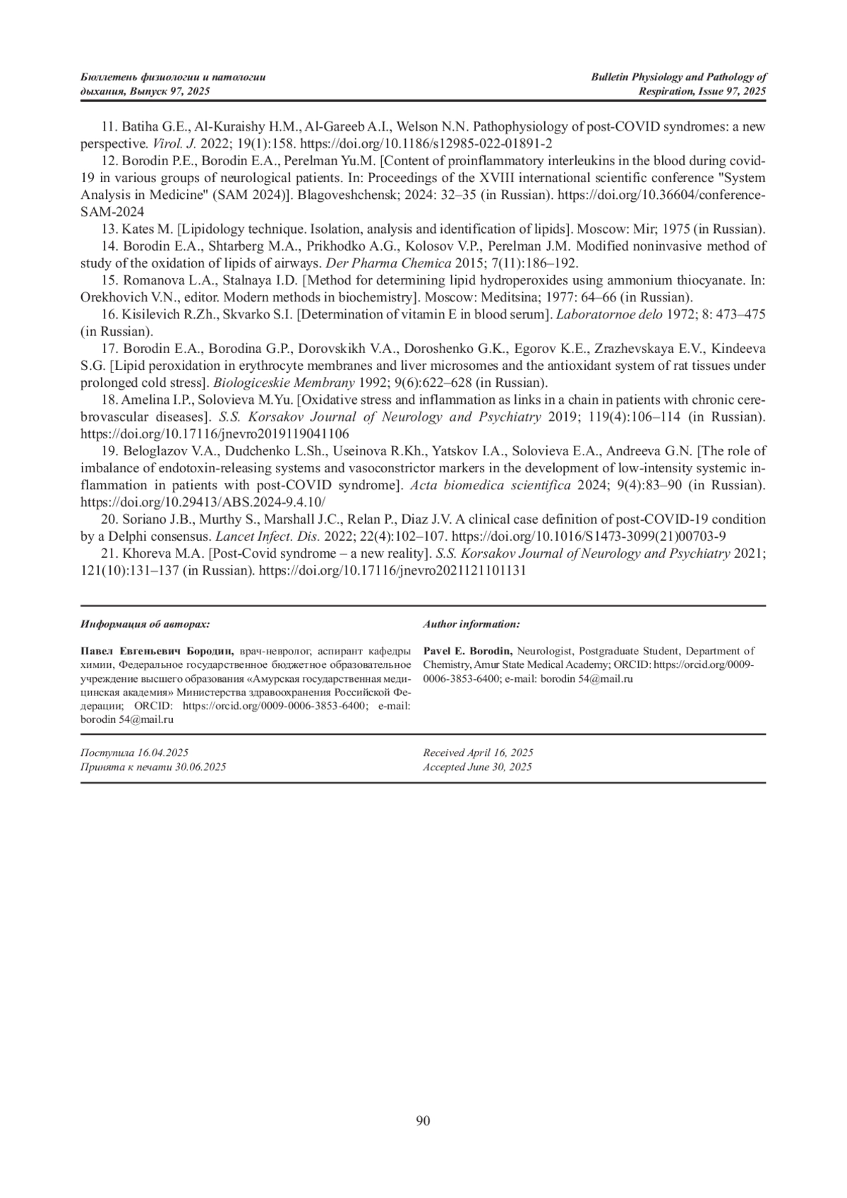12. Бородин П.Е., Бородин Е.А., Перельман Ю.М. Содержание в крови провоспалительных интерлейкинов при COVID-19 в различных группах неврологических больных // Материалы XVIII международной научной конференции “Системный анализ в медицине” (САМ 2024) / под общ. ред. В.П. Колосова. Благовещенск: ДНЦ ФПД, 2024. С.32-35. DOI: 10.36604/conference-SAM-2024